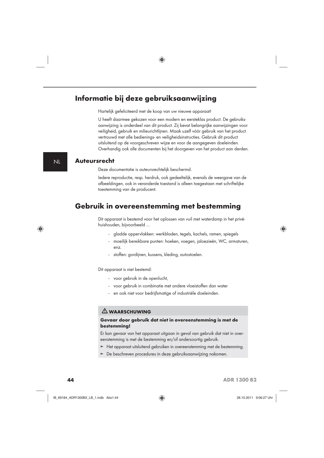 OPMERKING ► Controleer of de levering compleet is en of er sprake is van zichtbare schade. ► In geval de levering niet compleet is of indien er sprake is van schade door gebrekkige verpakking of door transport, neemt u contact op met de Service-Hotline (zie hoofdstuk Service). ADR 1300 B2 IB_69184_ADR1300B2_LB_1.indb Abs3:47