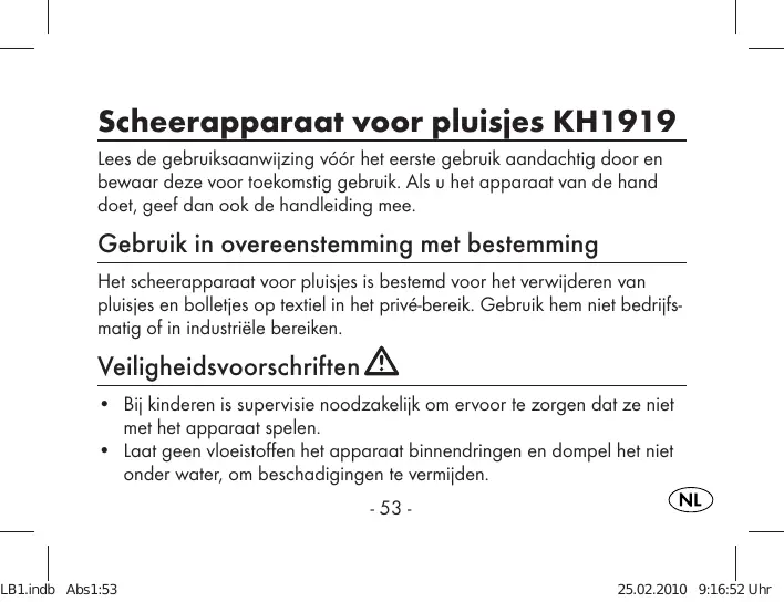 Scheerapparaat voor pluisjes KH1919 Lees de gebruiksaanwijzing vóór het eerste gebruik aandachtig door en bewaar deze voor toekomstig gebruik. Als u het apparaat van de hand doet, geef dan ook de handleiding mee. Gebruik in overeenstemming met bestemming Het scheerapparaat voor pluisjes is bestemd voor het verwijderen van pluisjes en bolletjes op textiel in het privé-bereik. Gebruik hem niet bedrijfsmatig of in industriële bereiken. Veiligheidsvoorschriften