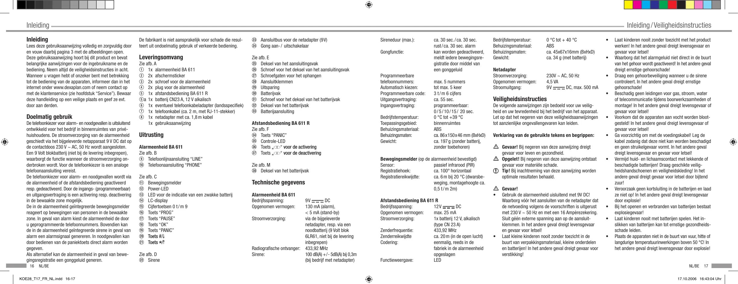 De in de alarmenheid geinteggreerde bewegingsmelder reageert op bewegingen van Personen in de bewaakte zone. In geval van alarm kiest de alarmenheid de door u geprogrammeerde telefoonnummers. Bovendien kan de in de alarmenheid geinteggreerde sirene in geval van alarm een alarmsignaal genereren. In noodegeallen kan door bedieren van de paniektoets direct alarm worden geveven.
