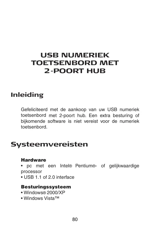 USB NUMERIEK TOETSENBORD MET 2-POORT HUB Inleiding Gefeliciteerd met de aankoop van uw USB numeriek toetsenbord met 2-poort hub. Een extra besturing of bijkomende software is niet vereist voor de numeriek toetsenbord. Systeemvereisten Hardware