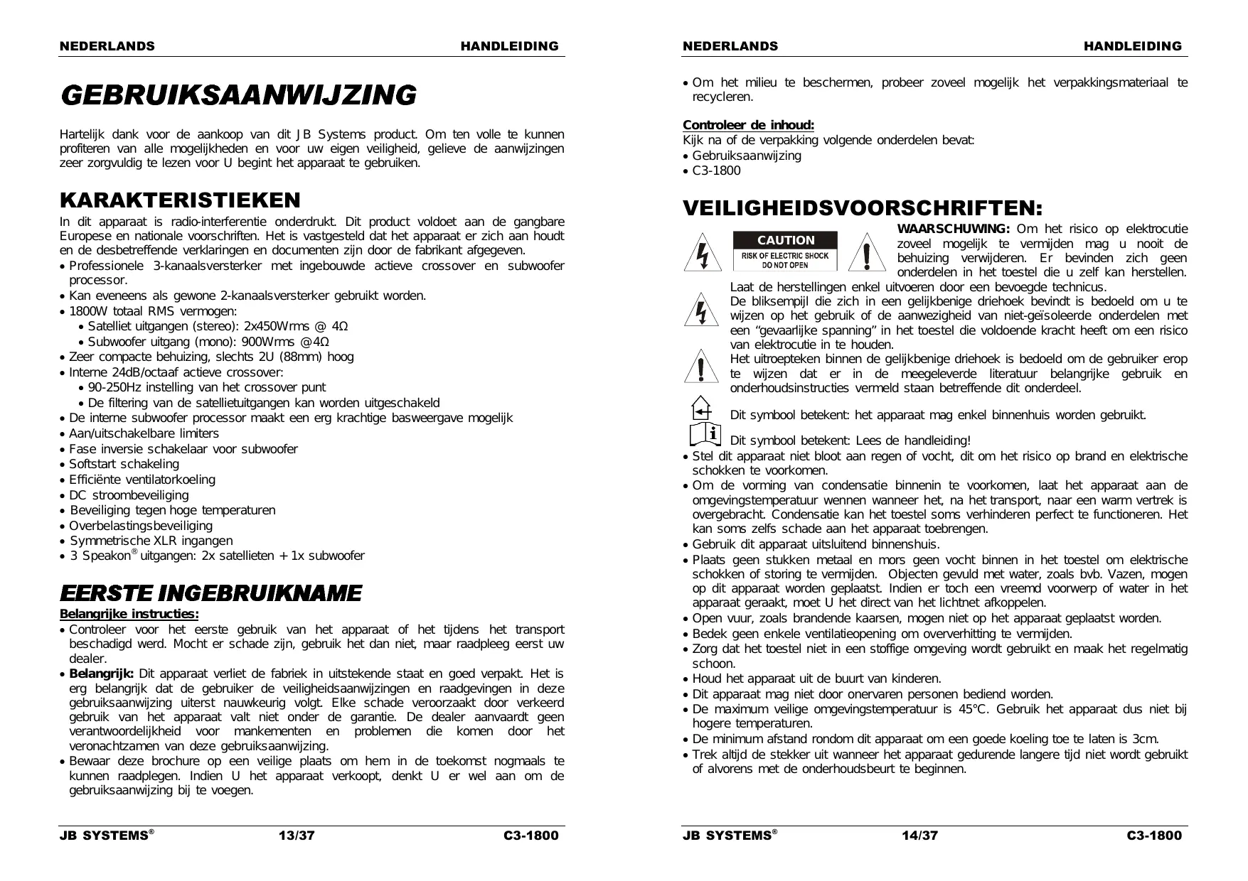 90-250Hz (24dB/oct. Linkwitz Riley) 770mV 20 kΩ (sym) / 10kΩ (asym) >90dB >500 Ventilateur à 2 vitesses XLR symétrique Speakon AC230V / 50Hz 483x473x88 (19"/2U) 24kg Chacune de ces informations peut être modifiée sans avertissement préalable. Vous pouvez télécharger la dernière version de ce mode d’emploi de notre site Web: www.beglec.com JB SYSTEMS® 12/37 C3-1800 NEDERLANDS HANDLEIDING NEDERLANDS HANDLEIDING Om het milieu te beschermen, probeer zoveel mogelijk het verpakkingsmateriaal te recycleren. Hartelijk dank voor de aankoop van dit JB Systems product. Om ten volle te kunnen profiteren van alle mogelijkheden en voor uw eigen veiligheid, gelieve de aanwijzingen zeer zorgvuldig te lezen voor U begint het apparaat te gebruiken. KARAKTERISTIEKEN In dit apparaat is radio-interferentie onderdrukt. Dit product voldoet aan de gangbare Europese en nationale voorschriften. Het is vastgesteld dat het apparaat er zich aan houdt en de desbetreffende verklaringen en documenten zijn door de fabrikant afgegeven. Professionele 3-kanaalsversterker met ingebouwde actieve crossover en subwoofer processor. Kan eveneens als gewone 2-kanaalsversterker gebruikt worden. 1800W totaal RMS vermogen: Satelliet uitgangen (stereo): 2x450Wrms @ 4Ω Subwoofer uitgang (mono): 900Wrms @4Ω Zeer compacte behuizing, slechts 2U (88mm) hoog Interne 24dB/octaaf actieve crossover: 90-250Hz instelling van het crossover punt De filtering van de satellietuitgangen kan worden uitgeschakeld De interne subwoofer processor maakt een erg krachtige basweergave mogelijk Aan/uitschakelbare limiters Fase inversie schakelaar voor subwoofer Softstart schakeling Efficiënte ventilatorkoeling DC stroombeveiliging Beveiliging tegen hoge temperaturen Overbelastingsbeveiliging Symmetrische XLR ingangen 3 Speakon® uitgangen: 2x satellieten + 1x subwoofer Belangrijke instructies: Controleer voor het eerste gebruik van het apparaat of het tijdens het transport beschadigd werd. Mocht er schade zijn, gebruik het dan niet, maar raadpleeg eerst uw dealer. Belangrijk: Dit apparaat verliet de fabriek in uitstekende staat en goed verpakt. Het is erg belangrijk dat de gebruiker de veiligheidsaanwijzingen en raadgevingen in deze gebruiksaanwijzing uiterst nauwkeurig volgt. Elke schade veroorzaakt door verkeerd gebruik van het apparaat valt niet onder de garantie. De dealer aanvaardt geen verantwoordelijkheid voor mankementen en problemen die komen door het veronachtzamen van deze gebruiksaanwijzing. Bewaar deze brochure op een veilige plaats om hem in de toekomst nogmaals te kunnen raadplegen. Indien U het apparaat verkoopt, denkt U er wel aan om de gebruiksaanwijzing bij te voegen. JB SYSTEMS® 13/37 C3-1800 Controleer de inhoud: Kijk na of de verpakking volgende onderdelen bevat: Gebruiksaanwijzing C3-1800 VEILIGHEIDSVOORSCHRIFTEN: WAARSCHUWING: Om het risico op elektrocutie zoveel mogelijk te vermijden mag u nooit de behuizing verwijderen. Er bevinden zich geen onderdelen in het toestel die u zelf kan herstellen. Laat de herstellingen enkel uitvoeren door een bevoegde technicus. De bliksempijl die zich in een gelijkbenige driehoek bevindt is bedoeld om u te wijzen op het gebruik of de aanwezigheid van niet-geïsoleerde onderdelen met een “gevaarlijke spanning” in het toestel die voldoende kracht heeft om een risico van elektrocutie in te houden. Het uitroepteken binnen de gelijkbenige driehoek is bedoeld om de gebruiker erop te wijzen dat er in de meegeleverde literatuur belangrijke gebruik en onderhoudsinstructies vermeld staan betreffende dit onderdeel. CAUTION Dit symbool betekent: het apparaat mag enkel binnenhuis worden gebruikt. Dit symbool betekent: Lees de handleiding! Stel dit apparaat niet bloot aan regen of vocht, dit om het risico op brand en elektrische schokken te voorkomen. Om de vorming van condensatie binnenin te voorkomen, laat het apparaat aan de omgevingstemperatuur wennen wanneer het, na het transport, naar een warm vertrek is overgebracht. Condensatie kan het toestel soms verhinderen perfect te functioneren. Het kan soms zelfs schade aan het apparaat toebrengen. Gebruik dit apparaat uitsluitend binnenshuis. Plaats geen stukken metaal en mors geen vocht binnen in het toestel om elektrische schokken of storing te vermijden. Objecten gevuld met water, zoals bvb. Vazen, mogen op dit apparaat worden geplaatst. Indien er toch een vreemd voorwerp of water in het apparaat geraakt, moet U het direct van het lichtnet afkoppelen. Open vuur, zoals brandende kaarsen, mogen niet op het apparaat geplaatst worden. Bedek geen enkele ventilatieopening om oververhitting te vermijden. Zorg dat het toestel niet in een stoffige omgeving wordt gebruikt en maak het regelmatig schoon. Houd het apparaat uit de buurt van kinderen. Dit apparaat mag niet door onervaren personen bediend worden. De maximum veilige omgevingstemperatuur is 45°C. Gebruik het apparaat dus niet bij hogere temperaturen. De minimum afstand rondom dit apparaat om een goede koeling toe te laten is 3cm. Trek altijd de stekker uit wanneer het apparaat gedurende langere tijd niet wordt gebruikt of alvorens met de onderhoudsbeurt te beginnen. JB SYSTEMS® 14/37 C3-1800 NEDERLANDS HANDLEIDING De elektrische installatie behoort uitsluitend uitgevoerd te worden door bevoegd personeel, volgens de in uw land geldende regels betreffende elektrische en mechanische veiligheid. Controleer dat de beschikbare spanning niet hoger is dan die aangegeven op de achterzijde van het toestel. Het stopcontact zal steeds vrij toegankelijk blijven zodat de stroomkabel op elk moment kan worden uitgetrokken. De elektrische kabel behoort altijd in uitstekende staat te zijn. Zet het apparaat onmiddellijk af als de elektrische kabel gekneusd of beschadigd is. Laat de elektrische draad nooit in contact komen met andere draden. Als de netschakelaar zich in OFF (uit) positie bevindt dan is dit apparaat niet volledig van het lichtnet gescheiden! Volgens de veiligheidsvoorschriften moet deze installa