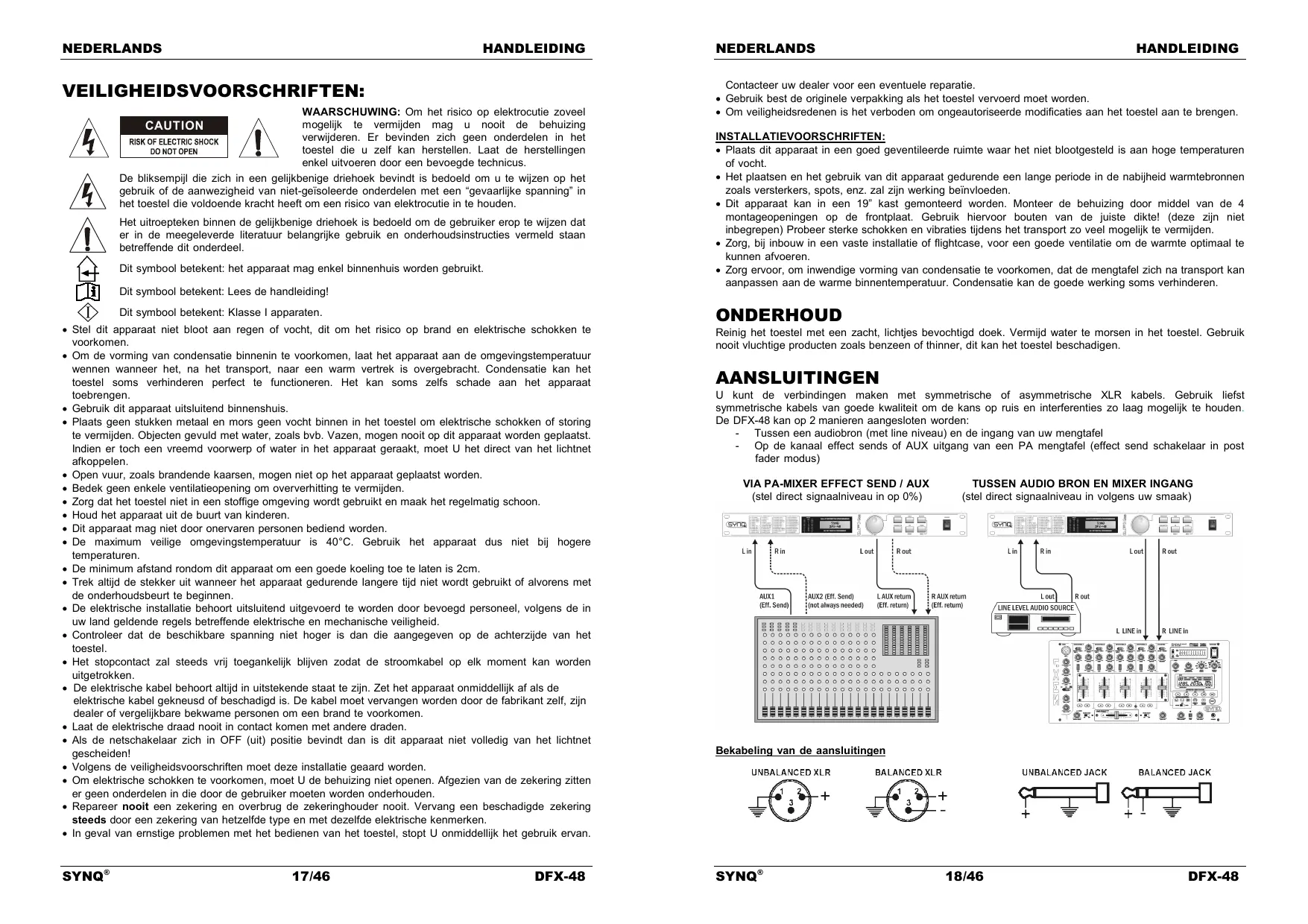 KARAKTERISTIEKEN In dit apparaat is radio-interferentie onderdrukt. Dit product voldoet aan de gangbare Europese en nationale voorschriften. Het is vastgesteld dat het apparaat er zich aan houdt en de desbetreffende verklaringen en documenten zijn door de fabrikant afgegeven. Professionele multi-effect processor op basis van 24bits DSP technologie 48 vooringestelde effecten (36 enkele + 12 gecombineerde effecten) 48 zelf instelbare programma’s & geheugens De effecten kunnen perfect ingesteld worden met meer dan 750 variaties Meegeleverde software voor het eenvoudig instellen via een Windows PC. Stel uw effecten nog preciezer in met de 5 bands equalizer 24bit sigma/delta AD/DA conversie met een 48 kHz sample rate Inschakelvertraging om storende inschakel clicks te vermijden. Duidelijke 16x2 alfanumerieke LCD display voorzien van blauwe verlichting. Componenten van uitstekende kwaliteit en een robuuste constructie voor ruw gebruik. Symmetrische XLR en 6,3mm jack in/uitgangen Voor professionele PA en studio, maar ook voor Pro DJ’s EERSTE INGEBRUIKNAME Belangrijke instructies: Controleer voor het eerste gebruik van het apparaat of het tijdens het transport beschadigd werd. Mocht er schade zijn, gebruik het dan niet, maar raadpleeg eerst uw dealer. Belangrijk: Dit apparaat verliet de fabriek in uitstekende staat en goed verpakt. Het is erg belangrijk dat de gebruiker de veiligheidsaanwijzingen en raadgevingen in deze gebruiksaanwijzing uiterst nauwkeurig volgt. Elke schade veroorzaakt door verkeerd gebruik van het apparaat valt niet onder de garantie. De dealer aanvaardt geen verantwoordelijkheid voor mankementen en problemen die komen door het veronachtzamen van deze gebruiksaanwijzing. Bewaar deze brochure op een veilige plaats om hem in de toekomst nogmaals te kunnen raadplegen. Indien U ooit het apparaat verkoopt mag u niet vergeten om de gebruiksaanwijzing bij te voegen. Om het milieu te beschermen, probeer zoveel mogelijk het verpakkingsmateriaal te recycleren. Controleer de inhoud: Kijk na of de verpakking volgende onderdelen bevat: Gebruiksaanwijzing DFX-48 effect processor CDROM met PC-software Stroomkabel Chacune de ces informations peut être modifiée sans avertissement préalable. Vous pouvez télécharger la dernière version de ce mode d’emploi de notre site Web: www.beglec.com SYNQ® 15/46 DFX-48 SYNQ® 16/46 DFX-48 NEDERLANDS HANDLEIDING VEILIGHEIDSVOORSCHRIFTEN: WAARSCHUWING: Om het risico op elektrocutie zoveel mogelijk te vermijden mag u nooit de behuizing verwijderen. Er bevinden zich geen onderdelen in het toestel die u zelf kan herstellen. Laat de herstellingen enkel uitvoeren door een bevoegde technicus. De bliksempijl die zich in een gelijkbenige driehoek bevindt is bedoeld om u te wijzen op het gebruik of de aanwezigheid van niet-geïsoleerde onderdelen met een “gevaarlijke spanning” in het toestel die voldoende kracht heeft om een risico van elektrocutie in te houden. CAUTION Het uitroepteken binnen de gelijkbenige driehoek is bedoeld om de gebruiker erop te wijzen dat er in de meegeleverde literatuur belangrijke gebruik en onderhoudsinstructies vermeld staan betreffende dit onderdeel. Dit symbool betekent: het apparaat mag enkel binnenhuis worden gebruikt. Dit symbool betekent: Lees de handleiding! Dit symbool betekent: Klasse I apparaten. Stel dit apparaat niet bloot aan regen of vocht, dit om het risico op brand en elektrische schokken te voorkomen. Om de vorming van condensatie binnenin te voorkomen, laat het apparaat aan de omgevingstemperatuur wennen wanneer het, na het transport, naar een warm vertrek is overgebracht. Condensatie kan het toestel soms verhinderen perfect te functioneren. Het kan soms zelfs schade aan het apparaat toebrengen. Gebruik dit apparaat uitsluitend binnenshuis. Plaats geen stukken metaal en mors geen vocht binnen in het toestel om elektrische schokken of storing te vermijden. Objecten gevuld met water, zoals bvb. Vazen, mogen nooit op dit apparaat worden geplaatst. Indien er toch een vreemd voorwerp of water in het apparaat geraakt, moet U het direct van het lichtnet afkoppelen. Open vuur, zoals brandende kaarsen, mogen niet op het apparaat geplaatst worden. Bedek geen enkele ventilatieopening om oververhitting te vermijden. Zorg dat het toestel niet in een stoffige omgeving wordt gebruikt en maak het regelmatig schoon. Houd het apparaat uit de buurt van kinderen. Dit apparaat mag niet door onervaren personen bediend worden. De maximum veilige omgevingstemperatuur is 40°C. Gebruik het apparaat dus niet bij hogere temperaturen. De minimum afstand rondom dit apparaat om een goede koeling toe te laten is 2cm. Trek altijd de stekker uit wanneer het apparaat gedurende langere tijd niet wordt gebruikt of alvorens met de onderhoudsbeurt te beginnen. De elektrische installatie behoort uitsluitend uitgevoerd te worden door bevoegd personeel, volgens de in uw land geldende regels betreffende elektrische en mechanische veiligheid. Controleer dat de beschikbare spanning niet hoger is dan die aangegeven op de achterzijde van het toestel. Het stopcontact zal steeds vrij toegankelijk blijven zodat de stroomkabel op elk moment kan worden uitgetrokken. De elektrische kabel behoort altijd in uitstekende staat te zijn. Zet het apparaat onmiddellijk af als de elektrische kabel gekneusd of beschadigd is. De kabel moet vervangen worden door de fabrikant zelf, zijn dealer of vergelijkbare bekwame personen om een brand te voorkomen. Laat de elektrische draad nooit in contact komen met andere draden. Als de netschakelaar zich in OFF (uit) positie bevindt dan is dit apparaat niet volledig van het lichtnet gescheiden! Volgens de veiligheidsvoorschriften moet deze installatie geaard worden. Om elektrische schokken te voorkomen, moet U de behuizing niet openen. Afgezien van de zekering zitten er geen onderdelen in die door de gebruiker moeten worden onderhouden. Repareer nooit een zekering en overbrug de zekeringhouder nooit. Vervang een beschadigde ze