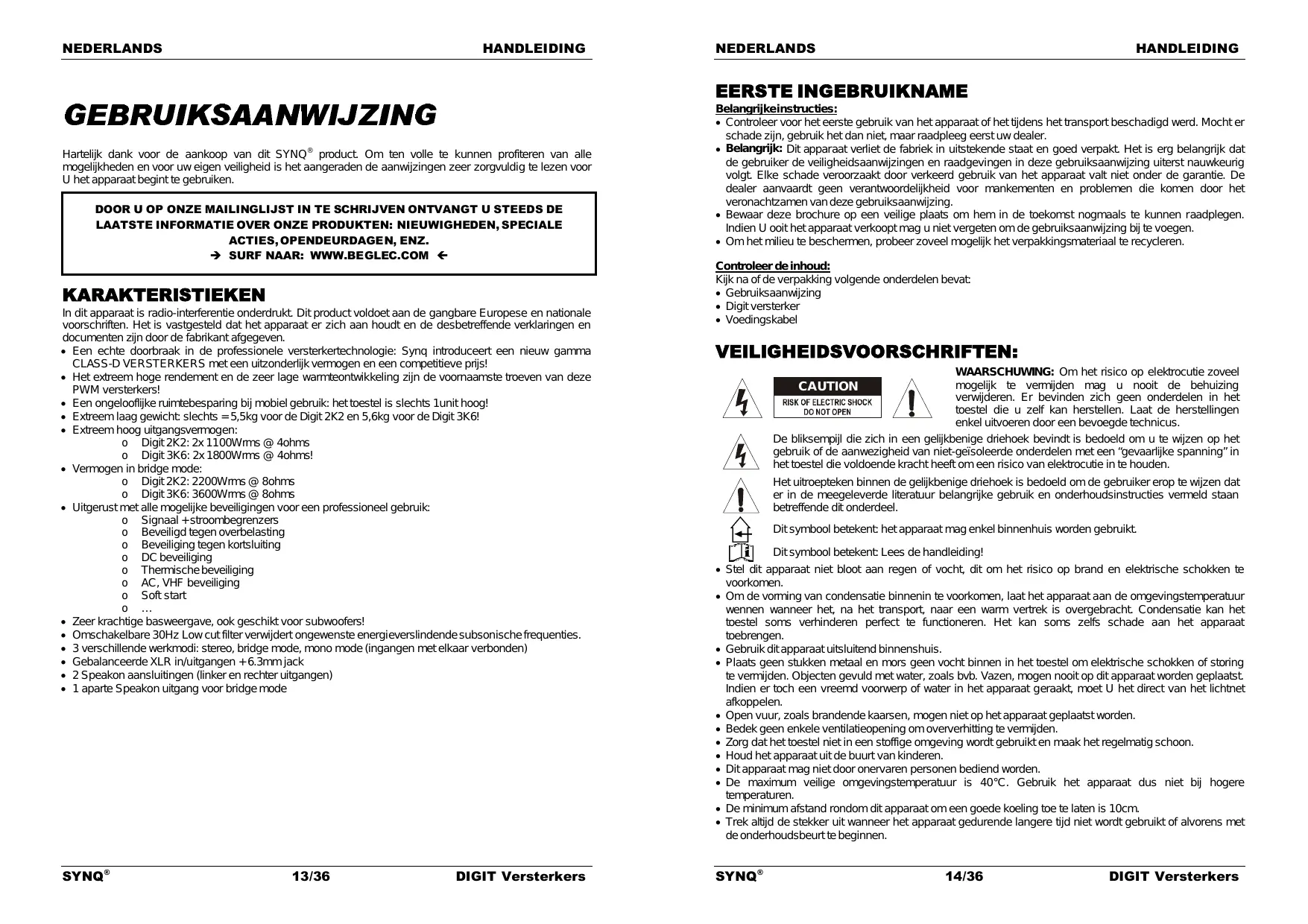 A gebruik of de aanwezigheïd van niet-geïsoleerde onderdelen met een “gevaarljke spanning” in \ | hettpestel die voldoende kracht heeft om een risico van elektrocutie in te houden. | Hetuitroepteken binnen de geljkbenige driehoek is bedoeld om de gebruiker erop te wijzen dat \ er in de meegeleverde literatuur belangrike gebruik en onderhoudsinstructies vemmeld staan / V\\ borrffende dt onderdeel. Ditsymbool betekent het apparaat mag enkel binnenhuis worden gebruikt. LT] … Ditsymbool betekent Lees de handleïding! + Stel dit apparaat niet bloot aan regen of vocht, dit om het risico op brand en elektrische schokken te voorkomen. + Om de vomming van condensatie binnenin te voorkomen, laat het apparaat aan de omgevingstemperatuur wennen wanneer het, na het transport, naar een warm vertrek is overgebracht. Condensatie kan het toestel soms verhinderen perfect te functioneren. Het kan soms zelfs schade aan het apparaat toebrengen. + Gebruik ditapparaat uitsluitend binnenshuis. + Plaats geen stukken metaal en mors geen vocht binnen in het toestel om elektrische schokken of storing te vemmijden. Objecten gevuld met water, zoals bvb. Vazen, mogen nooit op dit apparaat worden geplaatst. Indien er toch een vreemd voorwerp of water in het apparaat geraakt, moet U het direct van het lichtnet afkoppelen. + Open vuur, zoals brandende kaarsen, mogen niet op hetapparaat geplaatst worden. + Bedek geen enkele ventilatieopening om oververhitting te vermijden. + Zorg dat hettoestel niet in een stoffige omgeving wordt gebruikten maak het regelmatig schoon. + Houd het apparaat uit de buurt van kinderen. + Ditapparaat mag niet door onervaren personen bediend worden. + De maximum velige omgevingstemperatuur is 40°C. Gebruik het apparaat dus niet bi hogere temperaturen + De minimum afstand rondom dit apparaat om een goede koeling toe te laten is 10cm. + Trek altijd de stekker uit wanneer het apparaat gedurende langere tid niet wordt gebruikt of alvorens met de onderhoudsbeurtte beginnen. SYNQ° 14/36 DIGIT Versterkers