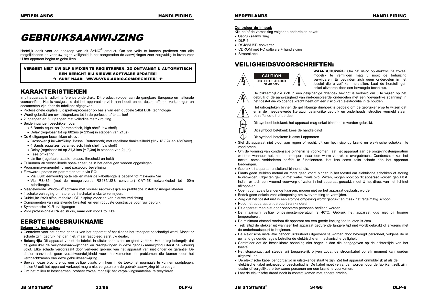 NEDERLANDS HANDLEIDING GEBRUIKSAANWIJZING Hartelik dank voor de aankoop van dit SYNQ° product. Om ten volle te kunnen profiteren van alle mogelikheden en voor uw eigen veiligheid is het aangeraden de aanwijzingen zeer zorgvuldig te lezen voor U het apparaat begint te gebruiken: NEDERLANDS HANDLEIDING VERGEET NIET UW DLP-6 MIXER TE REGISTREREN. ZO ONTVANGT U AUTOMATISCH EEN BERICHT B1J NIEUWE SOFTWARE UPDATES!