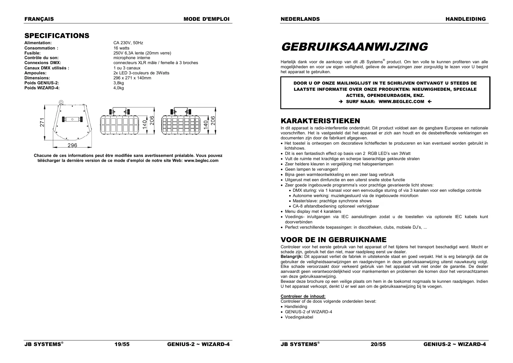 Controleer voor het eerste gebruik van het apparaat of het tijdens het transport beschadigd werd. Mocht er schade zijn, gebruik het dan niet, maar raadpleeg eerst uw dealer. Belangrijk: Dit apparaat verliet de fabriek in uitstekende staat en goed verpakt. Het is erg belangrijk dat de gebruiker de veiligheidsaanwijzingen en raadgevingen in deze gebruiksaanwijzing uiterst nauwkeurig volgt. Elke schade veroorzaakt door verkeerd gebruik van het apparaat valt niet onder de garantie. De dealer aanvaardt geen verantwoordelijkheid voor mankementen en problemen die komen door het veronachtzamen van deze gebruiksaanwijzing. Bewaar deze brochure op een veilige plaats om hem in de toekomst nogmaals te kunnen raadplegen. Indien U het apparaat verkoopt, denkt U er wel aan om de gebruiksaanwijzing bij te voegen. Controleer de inhoud: Controleer of de doos volgende onderdelen bevat: Handleiding GENIUS-2 of WIZARD-4 Voedingskabel JB SYSTEMS® 19/55 GENIUS-2 ~ WIZARD-4 JB SYSTEMS® 20/55 GENIUS-2 ~ WIZARD-4 NEDERLANDS HANDLEIDING VEILIGHEIDSVOORSCHRIFTEN: WAARSCHUWING: Om het risico op elektrocutie zoveel mogelijk te vermijden mag u nooit de behuizing verwijderen. Er bevinden zich geen onderdelen in het toestel die u zelf kan herstellen. Laat de herstellingen enkel uitvoeren door een bevoegde technicus. De bliksempijl die zich in een gelijkbenige driehoek bevindt is bedoeld om u te wijzen op het gebruik of de aanwezigheid van niet-geïsoleerde onderdelen met een “gevaarlijke spanning” in het toestel die voldoende kracht heeft om een risico van elektrocutie in te houden. CAUTION Het uitroepteken binnen de gelijkbenige driehoek is bedoeld om de gebruiker erop te wijzen dat er in de meegeleverde literatuur belangrijke gebruik en onderhoudsinstructies vermeld staan betreffende dit onderdeel. Dit symbool betekent: het apparaat mag enkel binnenhuis worden gebruikt. NEDERLANDS HANDLEIDING Om elektrische schokken te voorkomen, moet U de behuizing niet openen. Er zitten geen onderdelen in het toestel die door de gebruiker moeten worden onderhouden. Repareer nooit een zekering en overbrug de zekeringhouder nooit. Vervang een beschadigde zekering steeds door een zekering van hetzelfde type en met dezelfde elektrische kenmerken. In geval van ernstige problemen met het bedienen van het toestel, stopt U onmiddellijk het gebruik ervan. Contacteer uw dealer voor een eventuele reparatie. De behuizing en de lenzen moeten vervangen worden als ze zichtbaar beschadigd zijn. Gebruik best de originele verpakking als het toestel vervoerd moet worden. Om veiligheidsredenen is het verboden om wijzigingen aan het toestel aan te brengen. Belangrijk: Kijk nooit rechtstreeks in de lichtbron. Gebruik het lichteffect niet in aanwezigheid van personen die lijden aan epilepsie. BESCHRIJVING: Dit symbool betekent: Lees de handleiding! Dit symbool betekent: Klasse I apparaten Dit symbool bepaalt: de minimumafstand van te belichten voorwerpen. De minimumafstand tussen projector en het verlichte voorwerp moet meer dan 0,5 meter bedragen.