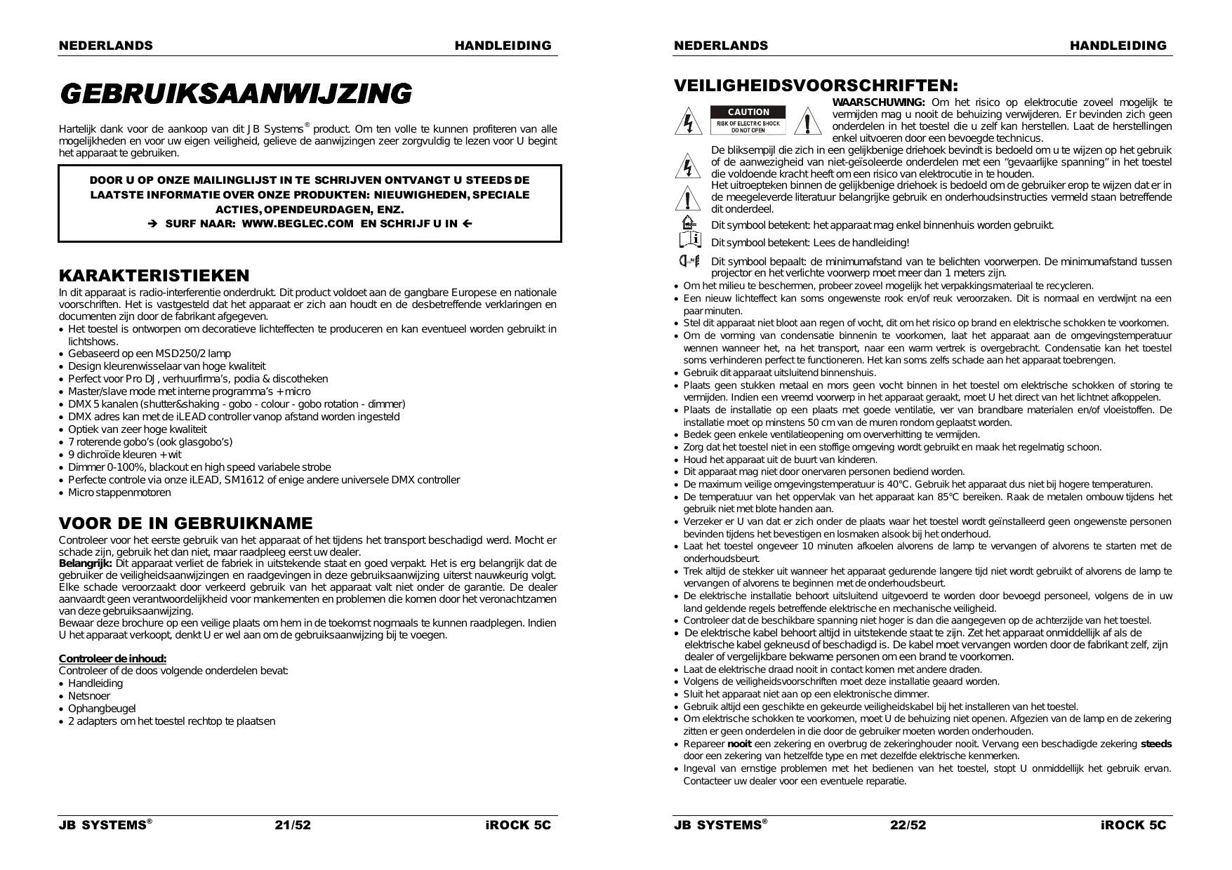 Laat de elektrische draad nooit in contact komen met andere draden. Volgens de veiligheidsvoorschriften moet deze installatie geaard worden. Sluit het apparaat niet aan op een elektronische dimmer. Gebruik altijd een geschikte en gekeurde veiligheidskabel bij het installeren van het toestel. Om elektrische schokken te voorkomen, moet U de behuizing niet openen. Afgezien van de lamp en de zekering zitten er geen onderdelen in die door de gebruiker moeten worden onderhouden. Repareer nooit een zekering en overbrug de zekeringhouder nooit. Vervang een beschadigde zekering steeds door een zekering van hetzelfde type en met dezelfde elektrische kenmerken. Ingeval van ernstige problemen met het bedienen van het toestel, stopt U onmiddellijk het gebruik ervan. Contacteer uw dealer voor een eventuele reparatie. iROCK 5C JB SYSTEMS® 22/52 iROCK 5C NEDERLANDS HANDLEIDING De behuizing en de lenzen moeten vervangen worden als ze zichtbaar beschadigd zijn. Gebruik best de originele verpakking als het toestel vervoerd moet worden. Om veiligheidsredenen is het verboden om ongeautoriseerde modificaties aan het toestel aan te brengen. Belangrijk: Kijk nooit rechtstreeks in de lichtbron. Gebruik het lichteffect niet in de tegenwoordigheid van personen die lijden aan epilepsie.