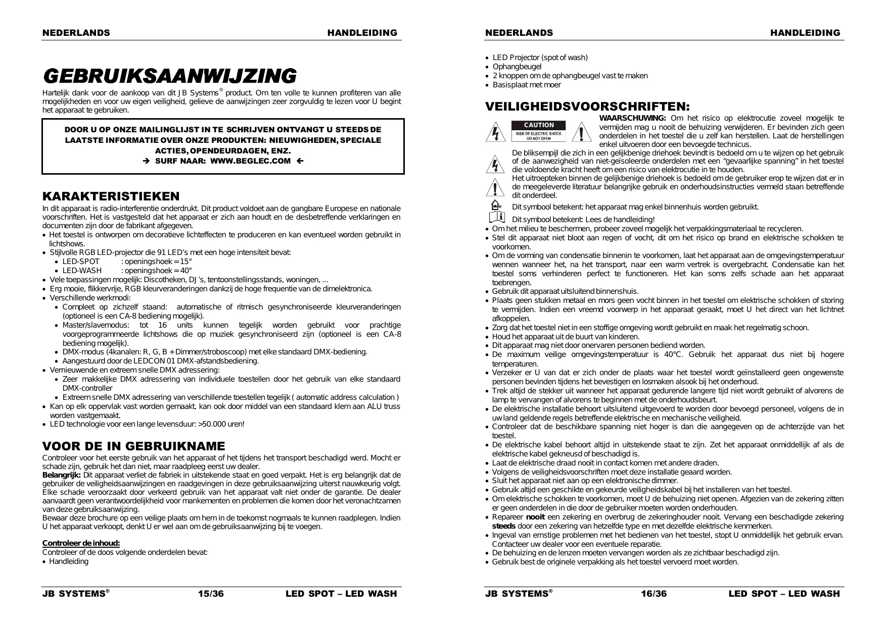 NEDERLANDS HANDLEIDING GEBRUIKSAANWIJZING Harteljk dank voor de aankoop van dit JB Systems” product. Om ten volle te kunnen profiteren van alle mogelikheden en voor uw eigen veiligheid, gelleve de aanwijzingen zeer zorgvuldig te lezen voor U begint het apparaat te gebruiken. NEDERLANDS HANDLEIDING DOOR U OP ONZE MAILINGLIJST IN TE SCHRIJVEN ONTVANGT U STEEDS DE LAATSTE INFORMATIE OVER ONZE PRODUKTEN: NIEUWIGHEDEN, SPECIALE ACTIES, OPENDEURDAGEN, ENZ.
