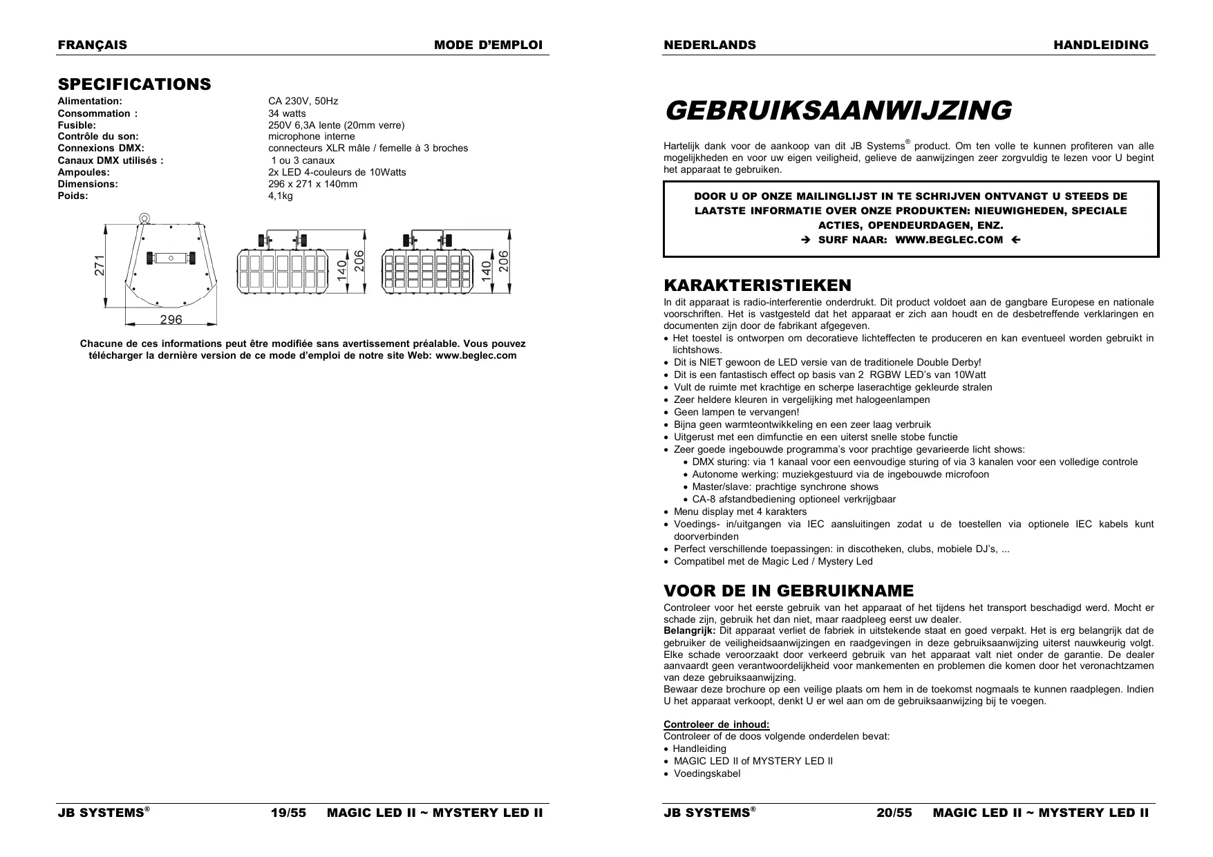 Controleer voor het eerste gebruik van het apparaat of het tijdens het transport beschadigd werd. Mocht er schade zijn, gebruik het dan niet, maar raadpleeg eerst uw dealer. Belangrijk: Dit apparaat verliet de fabriek in uitstekende staat en goed verpakt. Het is erg belangrijk dat de gebruiker de veiligheidsaanwijzingen en raadgevingen in deze gebruiksaanwijzing uiterst nauwkeurig volgt. Elke schade veroorzaakt door verkeerd gebruik van het apparaat valt niet onder de garantie. De dealer aanvaardt geen verantwoordelijkheid voor mankementen en problemen die komen door het veronachtzamen van deze gebruiksaanwijzing. Bewaar deze brochure op een veilige plaats om hem in de toekomst nogmaals te kunnen raadplegen. Indien U het apparaat verkoopt, denkt U er wel aan om de gebruiksaanwijzing bij te voegen. Controleer de inhoud: Controleer of de doos volgende onderdelen bevat: Handleiding MAGIC LED II of MYSTERY LED II Voedingskabel JB SYSTEMS® 19/55