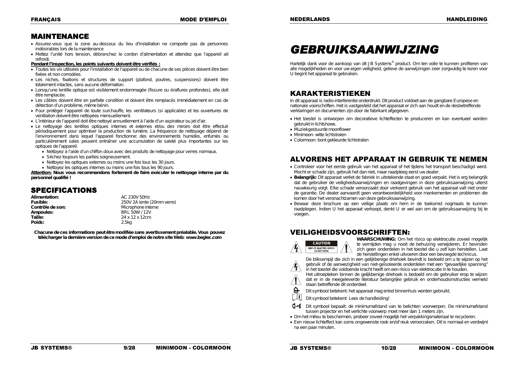 24 x 12 x 12cm 2.5kg Elke inlichting kan veranderen zonder waarschuwing vooraf U kan de laatste versie van deze handleiding downloaden via Onze website: www.beglec.com BEDIENINGSVOORSCHRIFTEN Als het apparaat op het net is aangesloten begint het te functioneren. Regelmatige pauzes bij het bedienen zijn noodzakelijk om het apparaat zo lang mogelijk te laten functioneren, daar het niet bedoeld is om onafgebroken te functioneren. Zet het toestel niet aan en uit met korte tussenpozen omdat de lamp het anders eerder begeeft. De oppervlaktetemperatuur van het apparaat kan 85º bereiken. Raak gedurende het bedienen van het apparaat de behuizing niet met blote handen aan. Trekt U altijd de stekker uit het stopcontact als het apparaat langere tijd geen dienst doet of alvorens een lamp te vervangen of alvorens een onderhoudsbeurt te beginnen. Stop, in geval van serieuze bedieningsproblemen, met het gebruiken van het apparaat en stel U onmiddellijk in verbinding met uw dealer. Belangrijk: Kijk nooit rechtstreeks in de lichtbron. Gebruik het effect nooit in de aanwezigheid van mensen die aan epilepsie lijden. ONDERHOUD Overtuig U ervan dat het gebied onder de installatieplaats vrij is van ongewenste personen tijdens het onderhoud. Zet het toestel uit, trek de netstekker uit het stopcontact en wacht tot het toestel is afgekoeld. Bij inspectie moeten de volgende punten worden gecontroleerd. Alle schroeven gebruikt om het te toestel te installeren en al zijn onderdelen moeten goed vastgedraaid zijn en mogen niet verroest zijn. Behuizingen, vastzetstukken, installeringplaatsen (plafond, spanten, schokbrekers) mogen absoluut niet verwrongen zijn. Wanneer een optische lens klaarblijkelijk beschadigd is door barsten of diepe krassen, dan moet deze vervangen worden. De stroomkabels moeten in perfecte staat zijn en behoren vervangen te worden, wanneer er zelfs maar een klein probleem ontdekt werd. JB SYSTEMS® 13/28