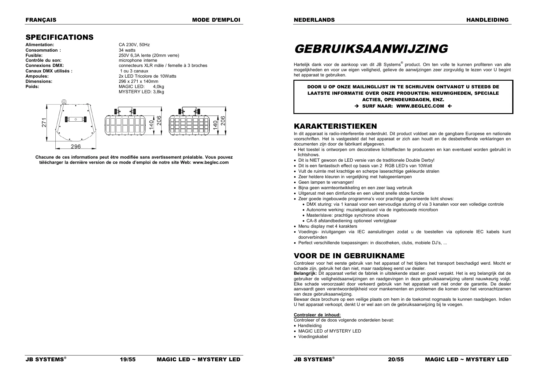 Hartelijk dank voor de aankoop van dit JB Systems product. Om ten volle te kunnen profiteren van alle mogelijkheden en voor uw eigen veiligheid, gelieve de aanwijzingen zeer zorgvuldig te lezen voor U begint het apparaat te gebruiken. DOOR U OP ONZE MAILINGLIJST IN TE SCHRIJVEN ONTVANGT U STEEDS DE LAATSTE INFORMATIE OVER ONZE PRODUKTEN: NIEUWIGHEDEN, SPECIALE ACTIES, OPENDEURDAGEN, ENZ.