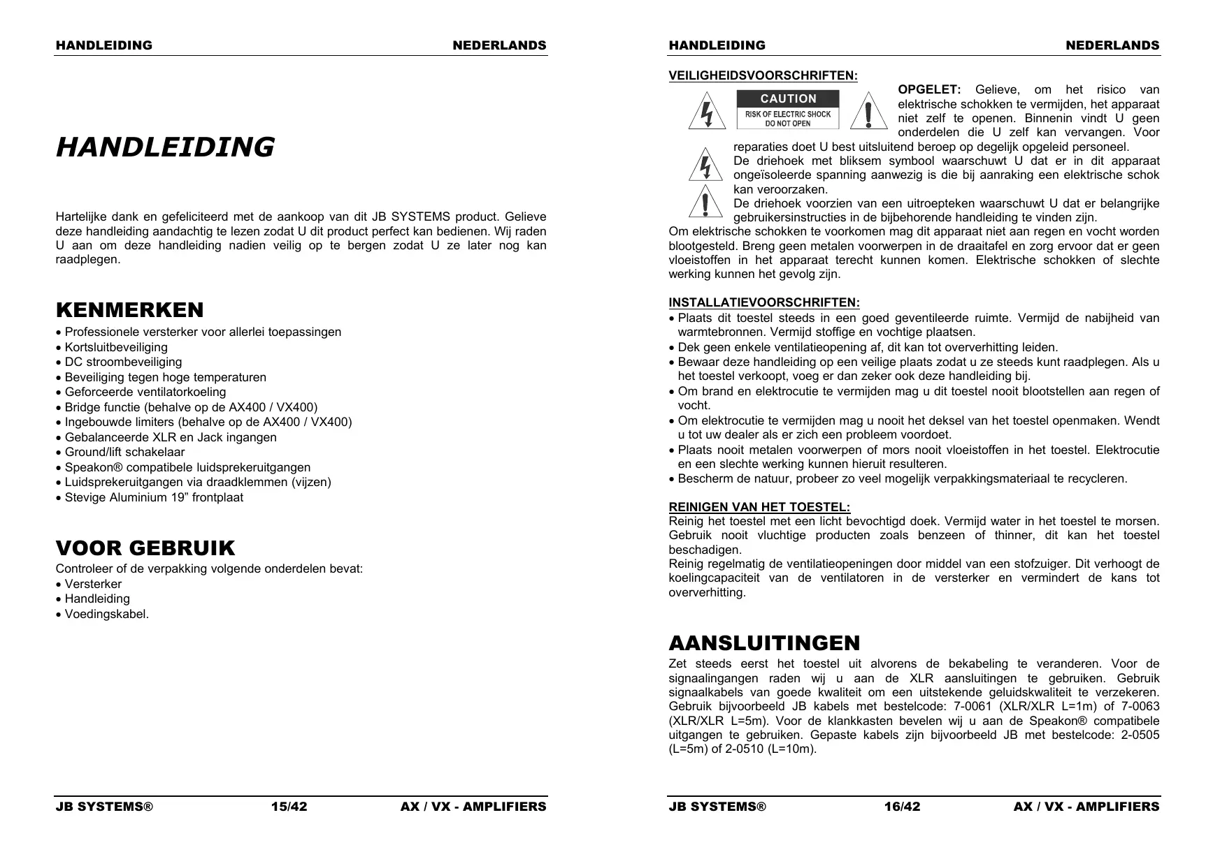 - Voedingskabel. AANSLUITINGEN Zet steeds eerst het toestel uit alvorens de bekabeling te veranderen. Voor de signaalingangen raden wij u aan de XLR aansluitingen te gebruiken. Gebruik signaalkabels van goede kwaliteit om een uitstekende geluidskwaliteit te verzekeren. Gebruik bijvoorbeeld JB kabels met bestelcode: 7-0061 (XLR/XLR L=1m) of 7-0063 (XLR/XLR L=5m). Voor de klankkasten bevelen wij u aan de Speakon® compatibele uitgangen te gebruiken. Gepaste kabels zijn bijvoorbeeld JB met bestelcode: 2-0505 (L=5m) of 2-0510 (L=10m). JB SYSTEMS® 15/42