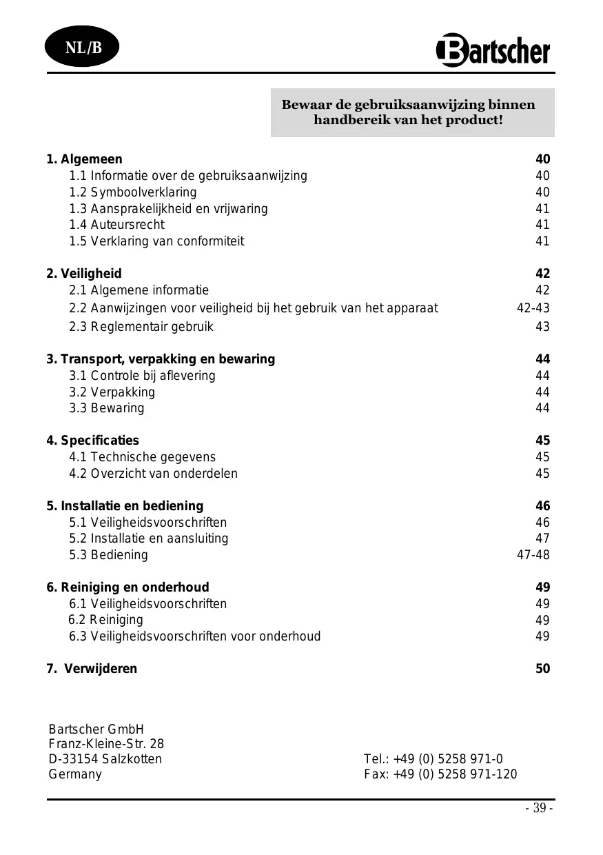 Vind de handleiding van het apparaat gratis A151.5001 BARTSCHER in PDF-formaat.