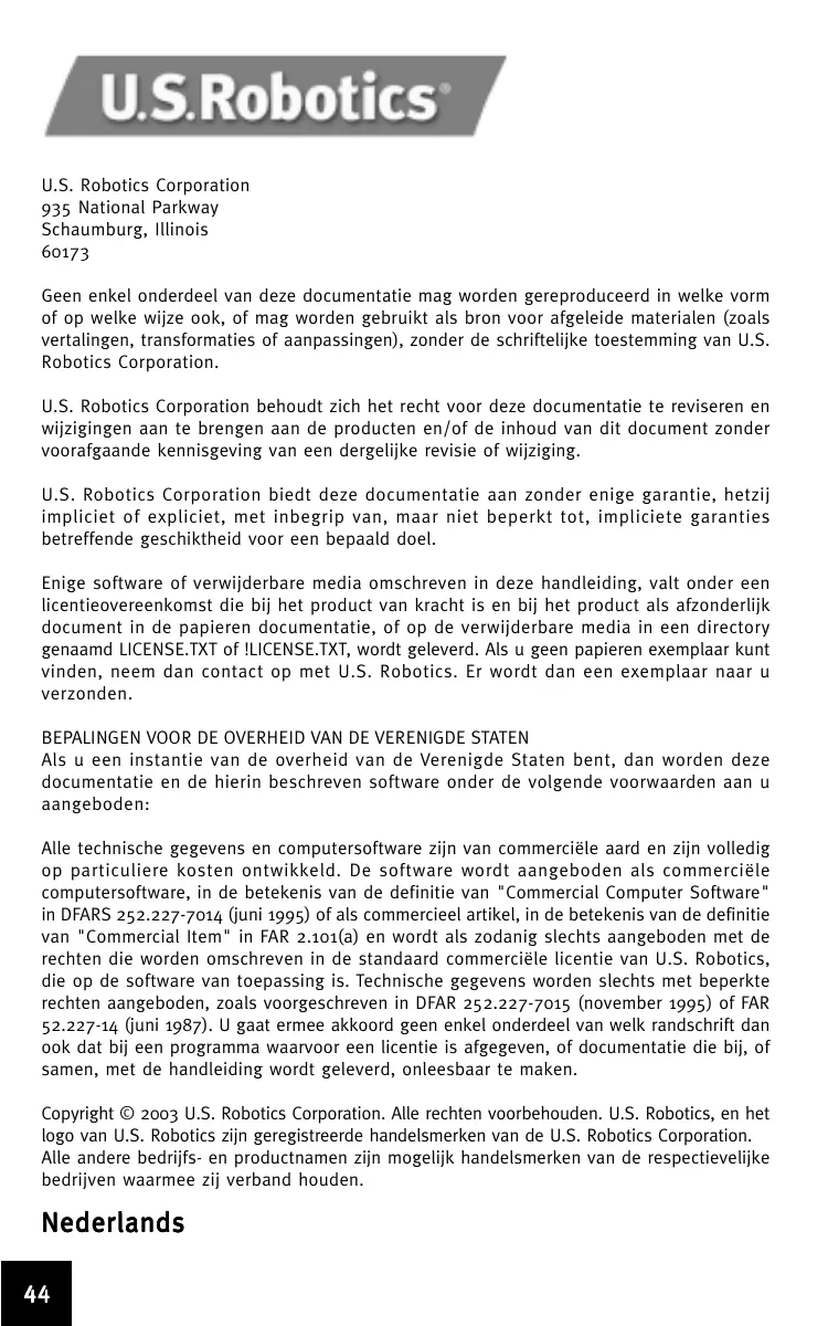 U.S. Robotics Corporation fournit cette documentation sans garantie implicite ou explicite d'aucune sorte, et notamment sans aucune garantie de commercialisation et d'adaptation à un usage particulier. Si cette documentation décrit un logiciel sur support amovible, ce dernier est soumis à un accord de licence inclus avec le produit sur un document séparé, soit sur la documentation écrite soit sur le support amovible, dans un fichier répertoire appelé LICENSE.TXT ou !LICENSE.TXT. Si vous ne parvenez pas à localiser un exemplaire, veuillez contacter U.S. Robotics qui vous en fera parvenir un. GOUVERNEMENT DES ETATS-UNIS Si vous êtes une agence du gouvernement des Etats-Unis, cette documentation et le logiciel qu'elle décrit vous sont fournis aux termes des conditions suivantes : Toutes les données techniques et les logiciels informatiques sont par nature commerciaux et développés uniquement sur des fonds privés. Le logiciel est fourni en tant que " Logiciel informatique commercial ", comme défini dans DFARS 252.227-7014 (juin 1995) ou en tant qu'" objet commercial ", comme défini dans FAR 2.101(a) et est donc fourni avec les mêmes droits que ceux énumérés dans la licence commerciale standard de logiciels U.S. Robotics. Les données techniques sont fournies avec des droits limités, comme défini dans DFAR 252.227-7015 (nov 1995) ou FAR 52.227-14 (juin 1987), suivant les cas. Vous vous engagez à ne pas retirer ou dégrader toute légende fournie sur un programme ou une documentation sous licence contenue dans ou livrée avec ce guide de l'utilisateur.