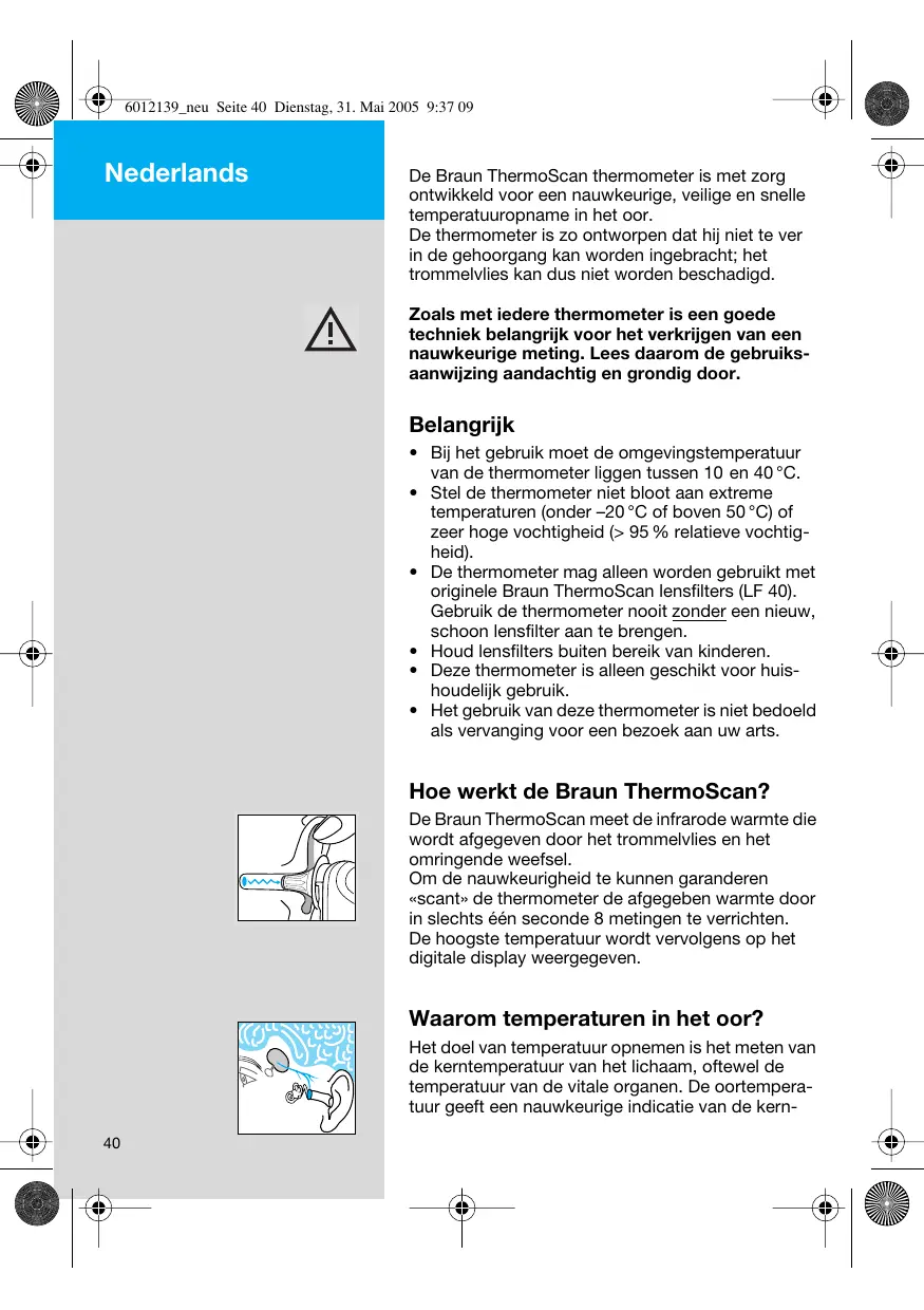 - Het gebruik van deze thermometer is niet bedoeld als vervanging voor een bezoek aan uw arts. Hoe werkt de Braun ThermoScan? De Braun ThermoScan meet de infrarode warmte die wordt afgegeven door het trommelvlies en het omringende weefsel. Om de nauwkeurigheid te kunnen garanderen «scant» de thermometer de afgegeben warmte door in slechts één seconde 8 metingen te verrichten. De hoogste temperatuur wordt vervolgens op het digitale display weergegeven. Waarom temperaturen in het oor? Het doel van temperatuur opnemen is het meten van de kerntemperatuur van het lichaam, oftewel de temperatuur van de vitale organen. De oortemperatuur geeft een nauwkeurige indicatie van de kern40 6012139_neu Seite 41 Dienstag, 31. Mai 2005 9:37 09 temperatuur omdat het trommelvlies de bloedtoevoer deelt met het centrum voor temperatuurregeling in de hersenen, de hypothalamus. Veranderingen in de lichaamstemperatuur worden daardoor sneller en naukeuriger waargenomen in het oor dan op andere plaatsen van het lichaam.