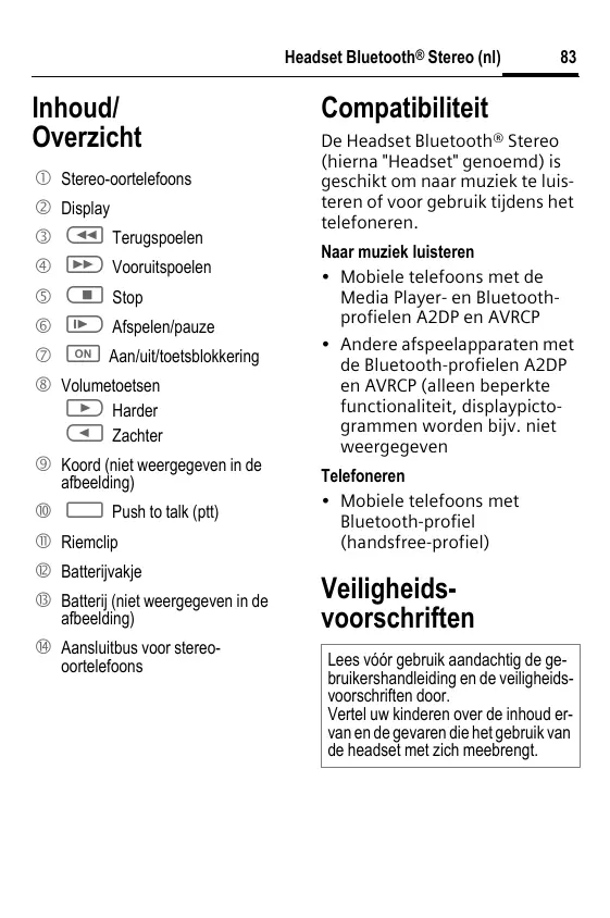Headset Bluetooth® Stereo (nl) 83 Inhoud/ Overzicht Stereo-oortelefoons Display C1) Terugspoelen @ TC») Vooruitspoelen C5) Stop Ü>) Afspelen/pauze Aan/uit/oetsblokkering ® Volumetoetsen CD Harder CI zachter © Koord (niet weergegeven in de afbeelding) ® C2 Pushtotalk (pt) ® Riemclip © Baterivakje ® Batteri (niet weergegeven in de afbeelding) 4 Aansluitbus voor stereo- oortelefoons Compatibiliteit De Headset Bluetooth® Stereo (hierna "Headset" genoemd) is geschikt om naar muziek te luis- teren of voor gebruik tijdens het telefoneren. Naar muziek luisteren Mobiele telefoons met de Media Player- en Bluetooth- profielen A2DP en AVRCP Andere afspeelapparaten met de Bluetooth-profielen A2DP en AVRCP (alleen beperkte functionaliteit, displaypicto- grammen worden bijv. niet weergegeven Telefoneren + Mobiele telefoons met Bluetooth-profiel (handsfree-profiel) Veiligheids- voorschriften Lees véér gebruik aandachtig de ge- bruikershandleiding en de veligheids- voorschrflen door. Vertel uw kinderen over de inhoud er- van en de gevaren die het gebruik van de headset met zich meebrengt.