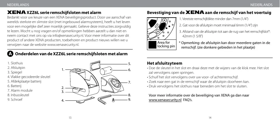 • Positionnez le bloque disque sur le disque de frein avant ou arrière de votre deux-roues. • Repérez un trou dans le disque de frein qui permettra à l’axe de verrouillage de passer à travers. • Tournez la clé dans le sens inverse des aiguilles d’une montre, la serrure se verrouille. Vous voulez en savoir plus? Consultez le site www.ica-security.com ou http://www.xenasecurity.com/home/current/lock_fr/