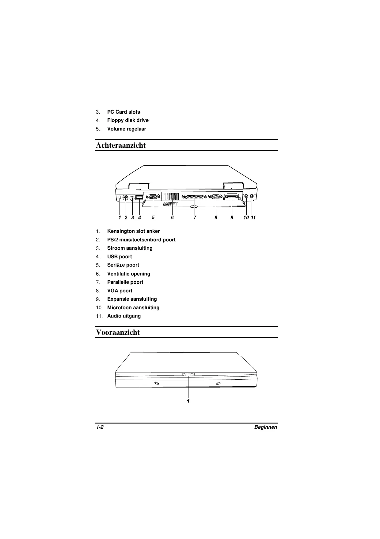 Om de notebook te sluiten, kantel de klep naar beneden tot de sluiting met een klik in zijn plaats valt. Zo niet, sluit dan de computer af door de aan/uit knop in te drukken. 1-6 Beginnen WAARSCHUWING: Als u de computer weer aan wilt zetten direkt nadat u hem uit heeft gezet, wacht dan minimaal vijf seconden. Uit en aan zetten van de notebook vlak achter elkaar kan het systeem circuit beschadigen.