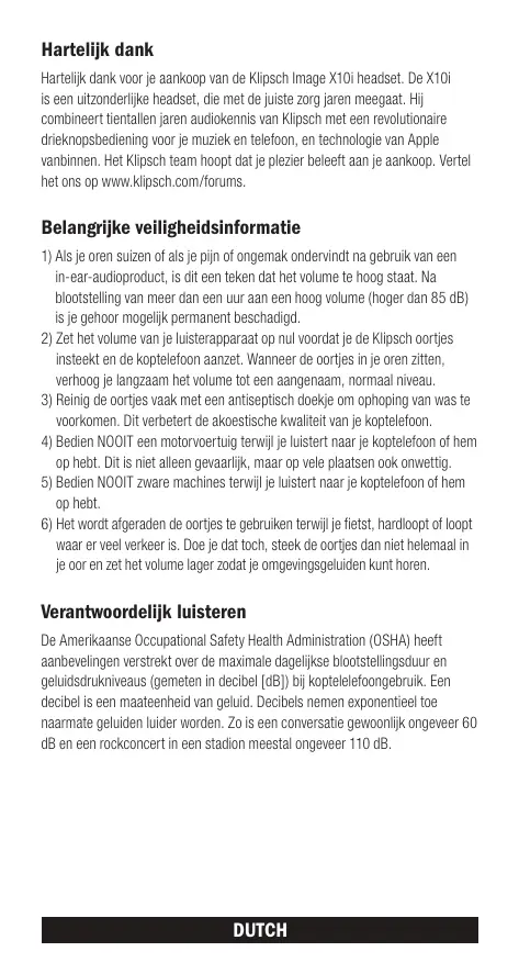 Belangrijke veiligheidsinformatie 1) Als je oren suizen of als je pijn of ongemak ondervindt na gebruik van een in-ear-audioproduct, is dit een teken dat het volume te hoog staat. Na blootstelling van meer dan een uur aan een hoog volume (hoger dan 85 dB) is je gehoor mogelijk permanent beschadigd. 2) Zet het volume van je luisterapparaat op nul voordat je de Klipsch oortjes insteekt en de koptelefoon aanzet. Wanneer de oortjes in je oren zitten, verhoog je langzaam het volume tot een aangenaam, normaal niveau. 3) Reinig de oortjes vaak met een antiseptisch doekje om ophoping van was te voorkomen. Dit verbetert de akoestische kwaliteit van je koptelefoon. 4) Bedien NOOIT een motorvoertuig terwijl je luistert naar je koptelefoon of hem op hebt. Dit is niet alleen gevaarlijk, maar op vele plaatsen ook onwettig. 5) Bedien NOOIT zware machines terwijl je luistert naar je koptelefoon of hem op hebt. 6) Het wordt afgeraden de oortjes te gebruiken terwijl je fietst, hardloopt of loopt waar er veel verkeer is. Doe je dat toch, steek de oortjes dan niet helemaal in je oor en zet het volume lager zodat je omgevingsgeluiden kunt horen.