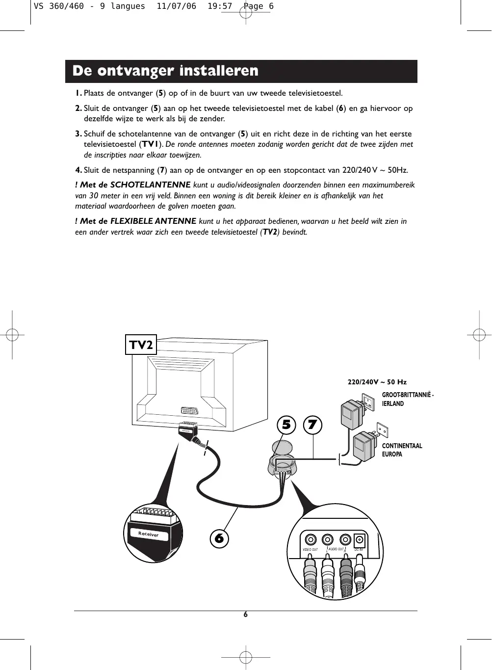 (TV1). Les antennes circulaires doivent être orientées de façon à ce que les faces portant des inscriptions soient dirigées l’une vers l’autre. 4. Branchez l’alimentation secteur (7) au récepteur et à une prise secteur 220/240V ~ 50 Hz. ! L’ANTENNE permet la diffusion du signal Audio-Video sur une portée maximum de 30 mètres en champ libre. A l’intérieur d’une habitation cette portée est inférieure et dépend des matériaux que les ondes auront à franchir. ! L’ANTENNE SOUPLE permet la commande de l’appareil dont vous souhaitez voir les images à partir de la pièce où se trouve le second téléviseur (TV2).