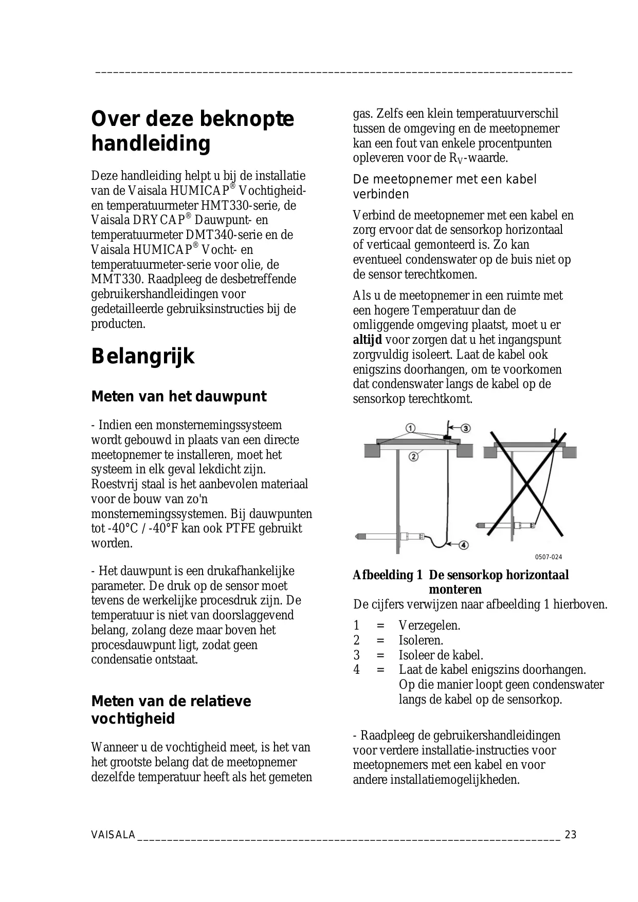 Over deze beknopte handleiding gas. Zelfs een klein temperatuurverschil tussen de omgeving en de meetopnemer kan een fout van enkele procentpunten opleveren voor de RV-waarde. Deze handleiding helpt u bij de installatie van de Vaisala HUMICAP® Vochtigheiden temperatuurmeter HMT330-serie, de Vaisala DRYCAP® Dauwpunt- en temperatuurmeter DMT340-serie en de Vaisala HUMICAP® Vocht- en temperatuurmeter-serie voor olie, de MMT330. Raadpleeg de desbetreffende gebruikershandleidingen voor gedetailleerde gebruiksinstructies bij de producten. De meetopnemer met een kabel verbinden Belangrijk Meten van het dauwpunt Verbind de meetopnemer met een kabel en zorg ervoor dat de sensorkop horizontaal of verticaal gemonteerd is. Zo kan eventueel condenswater op de buis niet op de sensor terechtkomen. Als u de meetopnemer in een ruimte met een hogere Temperatuur dan de omliggende omgeving plaatst, moet u er altijd voor zorgen dat u het ingangspunt zorgvuldig isoleert. Laat de kabel ook enigszins doorhangen, om te voorkomen dat condenswater langs de kabel op de sensorkop terechtkomt. - Indien een monsternemingssysteem wordt gebouwd in plaats van een directe meetopnemer te installeren, moet het systeem in elk geval lekdicht zijn. Roestvrij staal is het aanbevolen materiaal voor de bouw van zo'n monsternemingssystemen. Bij dauwpunten tot -40°C / -40°F kan ook PTFE gebruikt worden. 0507-024 - Het dauwpunt is een drukafhankelijke parameter. De druk op de sensor moet tevens de werkelijke procesdruk zijn. De temperatuur is niet van doorslaggevend belang, zolang deze maar boven het procesdauwpunt ligt, zodat geen condensatie ontstaat. Meten van de relatieve vochtigheid Wanneer u de vochtigheid meet, is het van het grootste belang dat de meetopnemer dezelfde temperatuur heeft als het gemeten Afbeelding 1 De sensorkop horizontaal monteren De cijfers verwijzen naar afbeelding 1 hierboven.