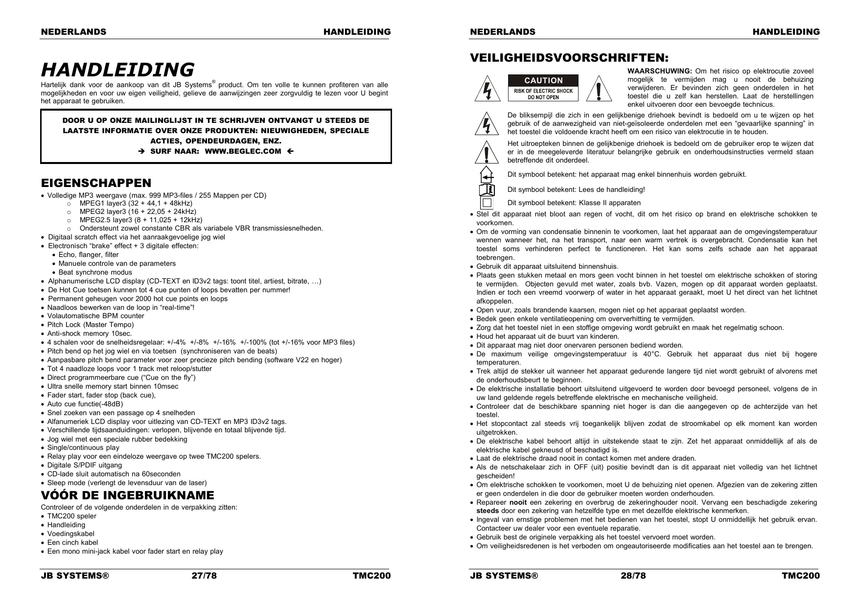 Hartelijk dank voor de aankoop van dit JB Systems® product. Om ten volle te kunnen profiteren van alle mogelijkheden en voor uw eigen veriligheid, gelieve de aanwijzingen zeer zorgvuldig te lezen voor U begint het apparaat te gezruiken.