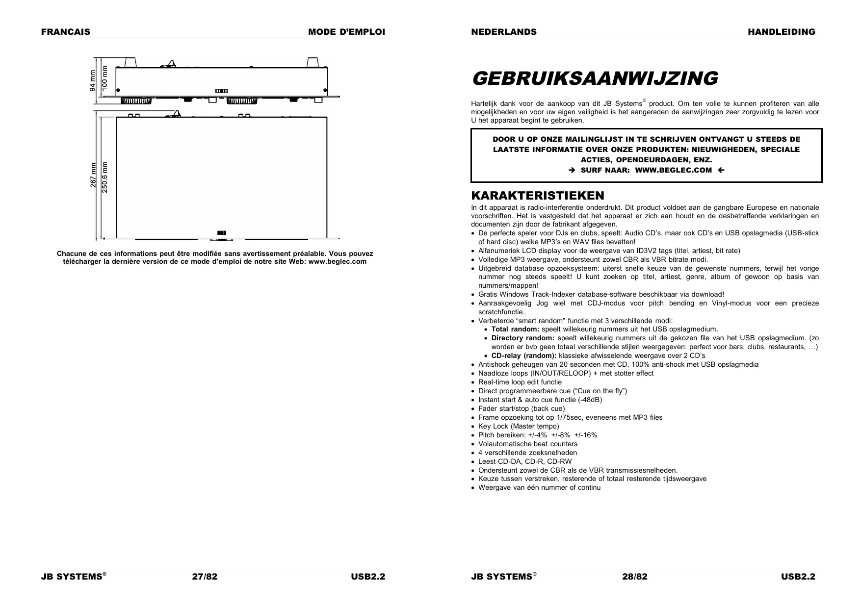 Hartelijk dank voor de aankoop van dit JB Systems® product. Om ten volte te kunnen profiteren van alle mogelijkheden en voor uw eigen verilgheid is het aangeraden de aanwijzingen zeer zorgvuldig te lezen voor U het apparaat begint te gebruiken.
