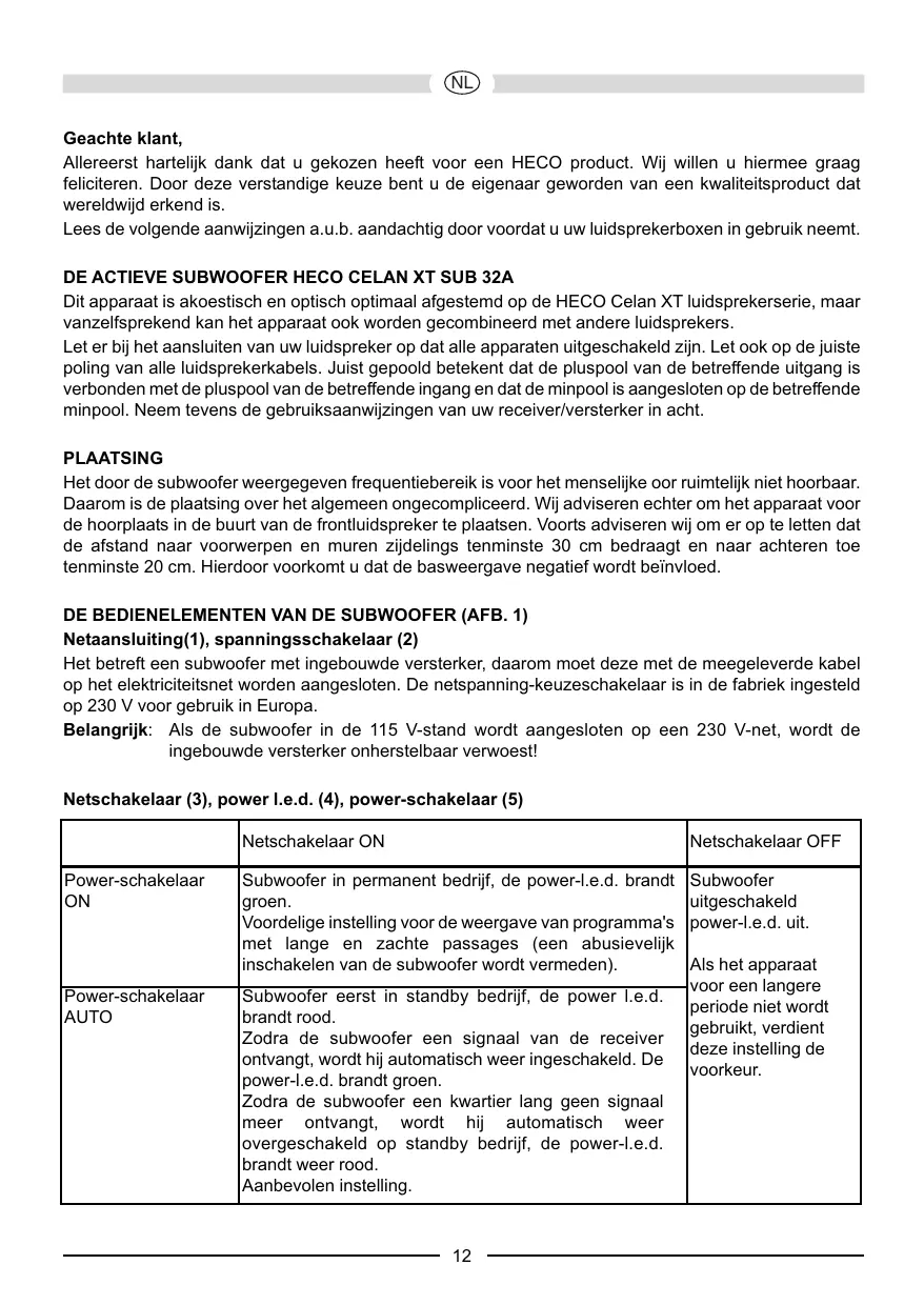 | Power-schakelaar AUTO | Subwoofer eerst in standby bedrijf, de power l.e.d.brandt rood.Zodra de subwoofer een signaal van de receiver ontvangt, worden hij automatisch waar ingeschakeld.De power-l.e.d.brandt groen.Zodra de subwoofer een kwartier lang geen signaalmeer ontvangt, worden hij automatisch waar overgeschakeld op standby bedrijf, de power-l.e.d.brandt watert rood.Aanbevolen instelling. |