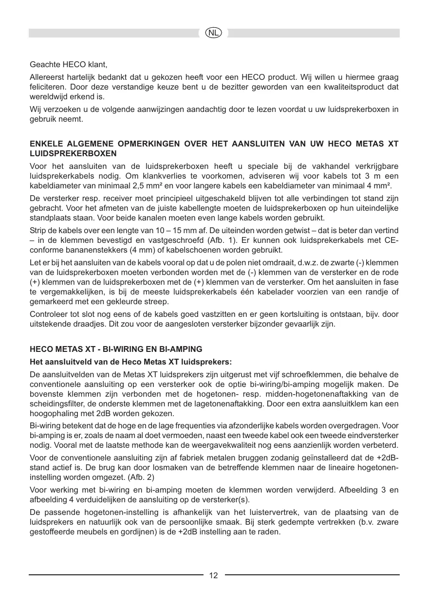 Geachte HECO klant, Allereerst hartelijk bedankt dat u gekozen heeft voor een HECO product. Wij willen u hiermee graag feliciteren. Door deze verstandige keuze bent u de bezitter geworden van een kwaliteitsproduct dat wereldwijd erkend is. Wij verzoeken u de volgende aanwijzingen aandachtig door te lezen voordat u uw luidsprekerboxen in gebruik neemt. ENKELE ALGEMENE OPMERKINGEN OVER HET AANSLUITEN VAN UW HECO METAS XT LUIDSPREKERBOXEN Voor het aansluiten van de luidsprekerboxen heeft u speciale bij de vakhandel verkrijgbare luidsprekerkabels nodig. Om klankverlies te voorkomen, adviseren wij voor kabels tot 3 m een kabeldiameter van minimaal 2,5 mm² en voor langere kabels een kabeldiameter van minimaal 4 mm². De versterker resp. receiver moet principieel uitgeschakeld blijven tot alle verbindingen tot stand zijn gebracht. Voor het afmeten van de juiste kabellengte moeten de luidsprekerboxen op hun uiteindelijke standplaats staan. Voor beide kanalen moeten even lange kabels worden gebruikt. Strip de kabels over een lengte van 10 – 15 mm af. De uiteinden worden getwist – dat is beter dan vertind – in de klemmen bevestigd en vastgeschroefd (Afb. 1). Er kunnen ook luidsprekerkabels met CEconforme bananenstekkers (4 mm) of kabelschoenen worden gebruikt. Let er bij het aansluiten van de kabels vooral op dat u de polen niet omdraait, d.w.z. de zwarte (-) klemmen van de luidsprekerboxen moeten verbonden worden met de (-) klemmen van de versterker en de rode (+) klemmen van de luidsprekerboxen met de (+) klemmen van de versterker. Om het aansluiten in fase te vergemakkelijken, is bij de meeste luidsprekerkabels één kabelader voorzien van een randje of gemarkeerd met een gekleurde streep. Controleer tot slot nog eens of de kabels goed vastzitten en er geen kortsluiting is ontstaan, bijv. door uitstekende draadjes. Dit zou voor de aangesloten versterker bijzonder gevaarlijk zijn. HECO METAS XT - BI-WIRING EN BI-AMPING Het aansluitveld van de Heco Metas XT luidsprekers: De aansluitvelden van de Metas XT luidsprekers zijn uitgerust met vijf schroefklemmen, die behalve de conventionele aansluiting op een versterker ook de optie bi-wiring/bi-amping mogelijk maken. De bovenste klemmen zijn verbonden met de hogetonen- resp. midden-hogetonenaftakking van de scheidingsfilter, de onderste klemmen met de lagetonenaftakking. Door een extra aansluitklem kan een hoogophaling met 2dB worden gekozen. Bi-wiring betekent dat de hoge en de lage frequenties via afzonderlijke kabels worden overgedragen. Voor bi-amping is er, zoals de naam al doet vermoeden, naast een tweede kabel ook een tweede eindversterker nodig. Vooral met de laatste methode kan de weergavekwaliteit nog eens aanzienlijk worden verbeterd. Voor de conventionele aansluiting zijn af fabriek metalen bruggen zodanig geïnstalleerd dat de +2dBstand actief is. De brug kan door losmaken van de betreffende klemmen naar de lineaire hogetoneninstelling worden omgezet. (Afb. 2) Voor werking met bi-wiring en bi-amping moeten de klemmen worden verwijderd. Afbeelding 3 en afbeelding 4 verduidelijken de aansluiting op de versterker(s). De passende hogetonen-instelling is afhankelijk van het luistervertrek, van de plaatsing van de luidsprekers en natuurlijk ook van de persoonlijke smaak. Bij sterk gedempte vertrekken (b.v. zware gestoffeerde meubels en gordijnen) is de +2dB instelling aan te raden.
