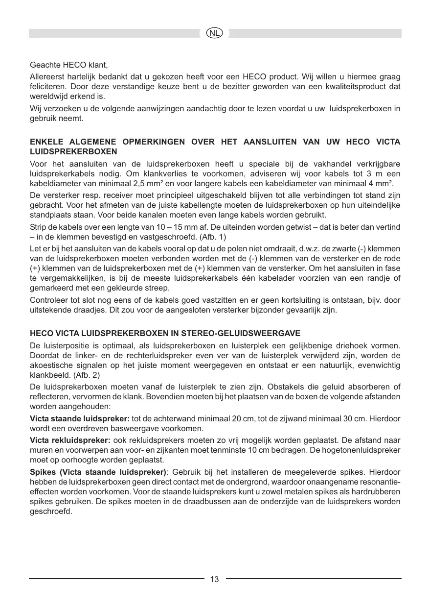 Geachte HECO klant, Allereerst hartelik bedankt dat u gekozen heeft voor een HECO product. Wij willen u hiermee graag feliciteren. Door deze verstandige keuze bent u de bezitter geworden van een kwaliteitsproduct dat wereldwijd erkend is. Wij verzoeken u de volgende aanwijzingen aandachtig door te lezen voordat u uw luidsprekerboxen in gebruik neemt. ENKELE ALGEMENE OPMERKINGEN OVER HET AANSLUITEN VAN UW HECO VICTA LUIDSPREKERBOXEN Voor het aansluiten van de luidsprekerboxen heeft u speciale bij de vakhandel verkrigbare luidsprekerkabels nodig. Om klankverlies te voorkomen, adviseren wij voor kabels tot 3 m een kabeldiameter van minimaal 2,5 mm? en voor langere kabels een kabeldiameter van minimaal 4 mm°. De versterker resp. receiver moet principieel uitgeschakeld bliven tot alle verbindingen tot stand zijn gebracht. Voor het afmeten van de juiste kabellengte moeten de luidsprekerboxen op hun uiteindelijke standplaats staan. Voor beide kanalen moeten even lange kabels worden gebruikt. Strip de kabels over een lengte van 10 — 15 mm af. De uiteinden worden getwist — dat is beter dan vertind — in de klemmen bevestigd en vastgeschroefd. (Aïb. 1) Let er bij het aansluiten van de kabels vooral op dat u de polen niet omdraait, d.w.z. de zwarte (-) klemmen van de luidsprekerboxen moeten verbonden worden met de (-) klemmen van de versterker en de rode (+) klemmen van de luidsprekerboxen met de (+) klemmen van de versterker. Om het aansluiten in fase te vergemakkelijken, is bij de meeste luidsprekerkabels één kabelader voorzien van een randje of gemarkeerd met een gekleurde streep. Controleer tot slot nog eens of de kabels goed vastzitten en er geen kortsiuiting is ontstaan, bi. door uitstekende draadjes. Dit zou voor de aangesloten versterker bijzonder gevaarlik zijn.