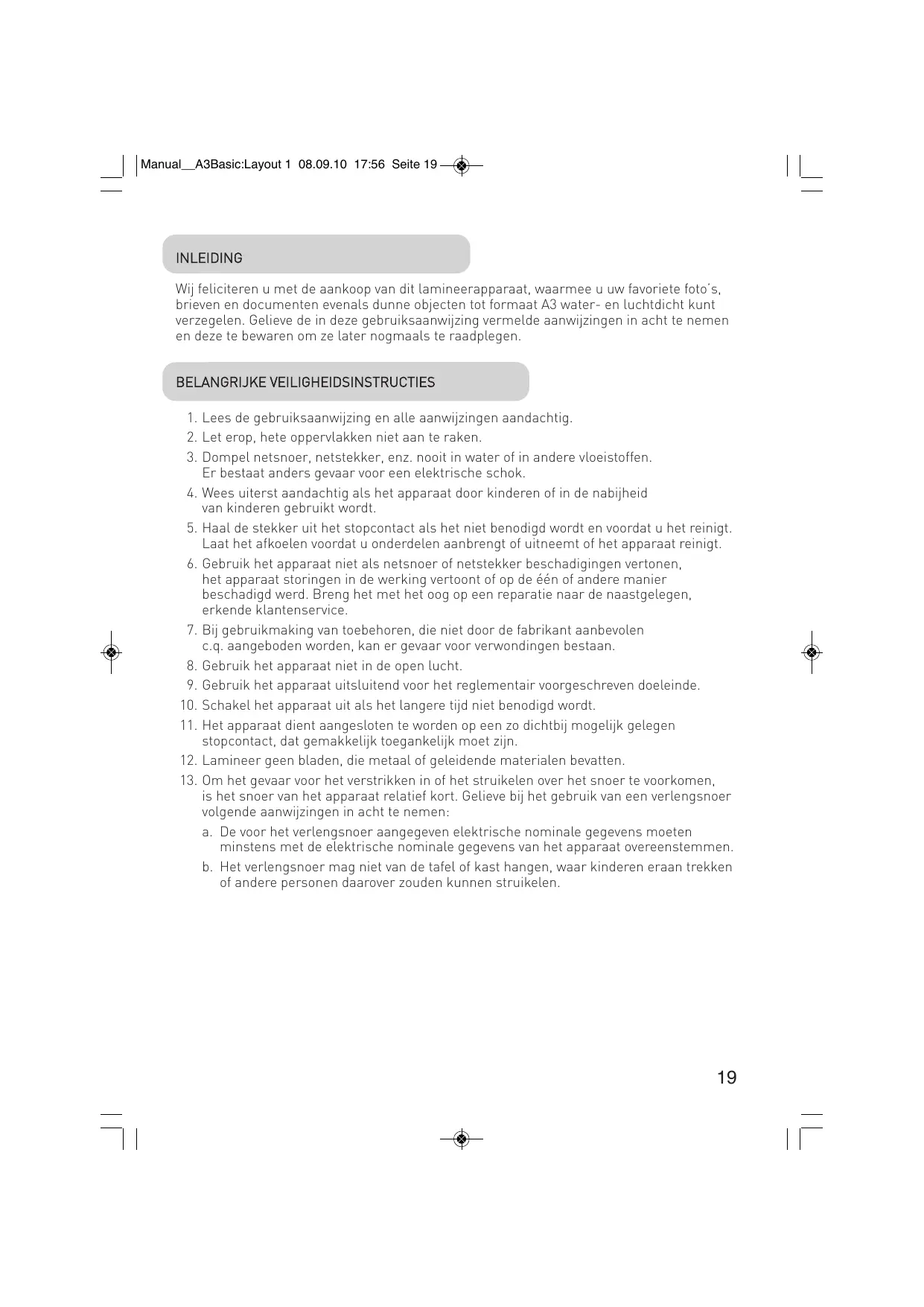 Manual__A3Basic:Layout 1 08.09.10 17:56 Seite 19 INLEIDING Wij feliciteren u met de aankoop van dit lamineerapparaat, waarmee u uw favoriete foto’s, brieven en documenten evenals dunne objecten tot formaat A3 water- en luchtdicht kunt verzegelen. Gelieve de in deze gebruiksaanwijzing vermelde aanwijzingen in acht te nemen en deze te bewaren om ze later nogmaals te raadplegen. BELANGRIJKE VEILIGHEIDSINSTRUCTIES