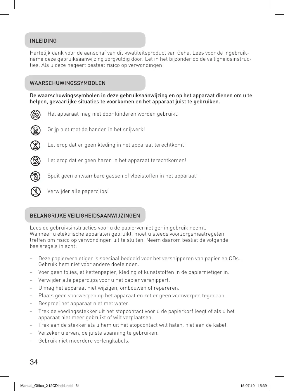 Inleiding Hartelijk dank voor de aanschaf van dit kwaliteitsproduct van Geha. Lees voor de ingebruikname deze gebruiksaanwijzing zorgvuldig door. Let in het bijzonder op de veiligheidsinstructies. Als u deze negeert bestaat risico op verwondingen! Waarschuwingssymbolen De waarschuwingssymbolen in deze gebruiksaanwijzing en op het apparaat dienen om u te helpen, gevaarlijke situaties te voorkomen en het apparaat juist te gebruiken.