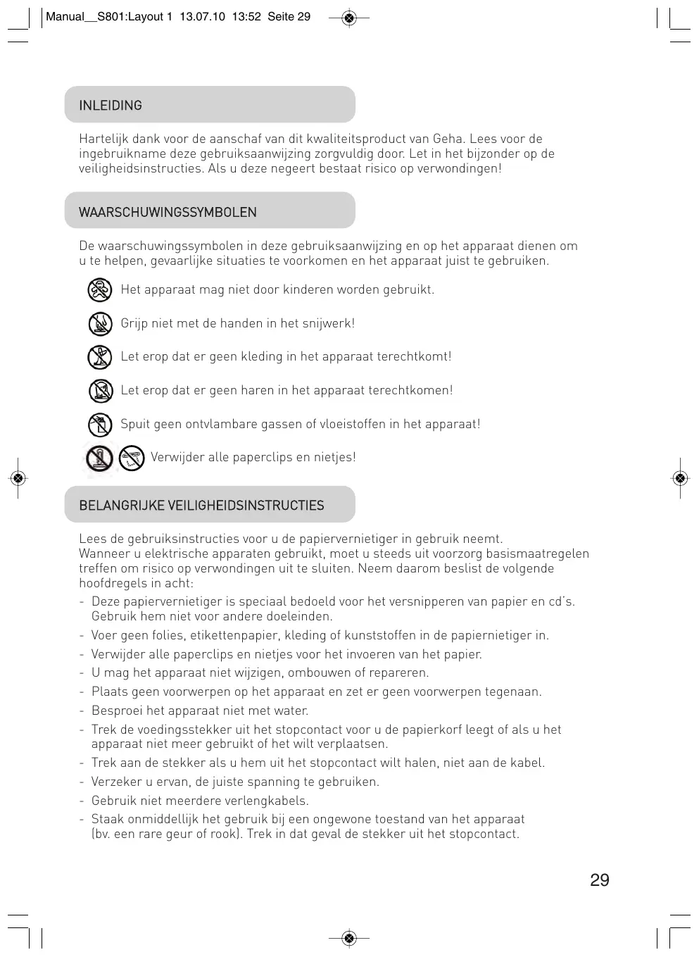 Manual__S801:Layout 1 13.07.10 13:52 Seite 29 INLEIDING Hartelijk dank voor de aanschaf van dit kwaliteitsproduct van Geha. Lees voor de ingebruikname deze gebruiksaanwijzing zorgvuldig door. Let in het bijzonder op de veiligheidsinstructies. Als u deze negeert bestaat risico op verwondingen! WAARSCHUWINGSSYMBOLEN De waarschuwingssymbolen in deze gebruiksaanwijzing en op het apparaat dienen om u te helpen, gevaarlijke situaties te voorkomen en het apparaat juist te gebruiken. Het apparaat mag niet door kinderen worden gebruikt. Grijp niet met de handen in het snijwerk! Let erop dat er geen kleding in het apparaat terechtkomt! Let erop dat er geen haren in het apparaat terechtkomen! Spuit geen ontvlambare gassen of vloeistoffen in het apparaat! Verwijder alle paperclips en nietjes! BELANGRIJKE VEILIGHEIDSINSTRUCTIES Lees de gebruiksinstructies voor u de papiervernietiger in gebruik neemt. Wanneer u elektrische apparaten gebruikt, moet u steeds uit voorzorg basismaatregelen treffen om risico op verwondingen uit te sluiten. Neem daarom beslist de volgende hoofdregels in acht: - Deze papiervernietiger is speciaal bedoeld voor het versnipperen van papier en cd’s. Gebruik hem niet voor andere doeleinden. - Voer geen folies, etikettenpapier, kleding of kunststoffen in de papiernietiger in. - Verwijder alle paperclips en nietjes voor het invoeren van het papier. - U mag het apparaat niet wijzigen, ombouwen of repareren. - Plaats geen voorwerpen op het apparaat en zet er geen voorwerpen tegenaan. - Besproei het apparaat niet met water. - Trek de voedingsstekker uit het stopcontact voor u de papierkorf leegt of als u het apparaat niet meer gebruikt of het wilt verplaatsen. - Trek aan de stekker als u hem uit het stopcontact wilt halen, niet aan de kabel. - Verzeker u ervan, de juiste spanning te gebruiken. - Gebruik niet meerdere verlengkabels. - Staak onmiddellijk het gebruik bij een ongewone toestand van het apparaat (bv. een rare geur of rook). Trek in dat geval de stekker uit het stopcontact.