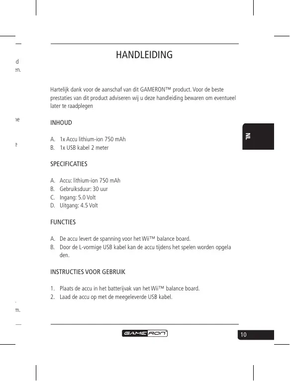 über eine spreher und ziert die Accu: lithium-ion 750 mAh Gebruiksduur: 30 uur Ingang: 5.0 Volt Uitgang: 4.5 Volt FUNCTIES A. De accu levert de spanning voor het Wii™ balance board. B. Door de L-vormige USB kabel kan de accu tijdens het spelen worden opgela den.