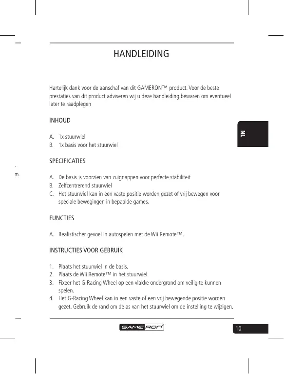 und Hartelijk dank voor de aanschaf van dit GAMERON™ product. Voor de beste prestaties van dit product adviseren wij u deze handleiding bewaren om eventueel later te raadplegen SPECIFICATIES A. De basis is voorzien van zuignappen voor perfecte stabiliteit B. Zelfcentrerend stuurwiel C. Het stuurwiel kan in een vaste positie worden gezet of vrij bewegen voor speciale bewegingen in bepaalde games. FUNCTIES A. Realistischer gevoel in autospelen met de Wii Remote™.