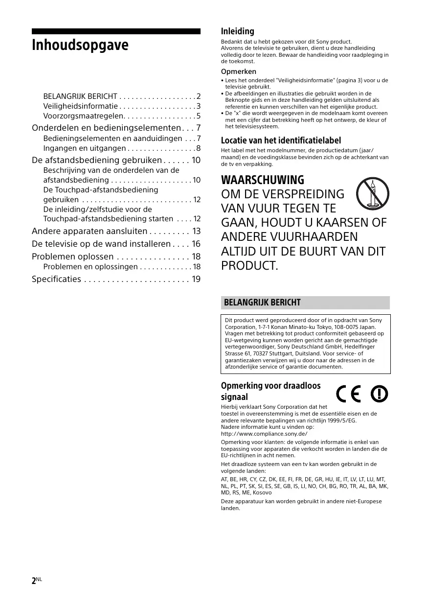 - La marca N es una marca comercial o una marca comercial registrada de NFC Forum, Inc. en Estados Unidos y otros países. Inleiding Inhoudsopgave Bedankt dat u hebt gekozen voor dit Sony product. Alvorens de televisie te gebruiken, dient u deze handleiding volledig door te lezen. Bewaar de handleiding voor raadpleging in de toekomst. Opmerken BELANGRIJK BERICHT . . . . . . . . . . . . . . . . . . . 2 Veiligheidsinformatie . . . . . . . . . . . . . . . . . . . 3 Voorzorgsmaatregelen. . . . . . . . . . . . . . . . . . 5 Onderdelen en bedieningselementen . . . 7 Bedieningselementen en aanduidingen . . . 7 Ingangen en uitgangen . . . . . . . . . . . . . . . . . 8 De afstandsbediening gebruiken . . . . . . 10 Beschrijving van de onderdelen van de afstandsbediening . . . . . . . . . . . . . . . . . . . . 10 De Touchpad-afstandsbediening gebruiken . . . . . . . . . . . . . . . . . . . . . . . . . . . 12 De inleiding/zelfstudie voor de Touchpad-afstandsbediening starten . . . . 12 Andere apparaten aansluiten . . . . . . . . . 13 De televisie op de wand installeren . . . . 16 Problemen oplossen . . . . . . . . . . . . . . . . 18 Problemen en oplossingen . . . . . . . . . . . . . 18