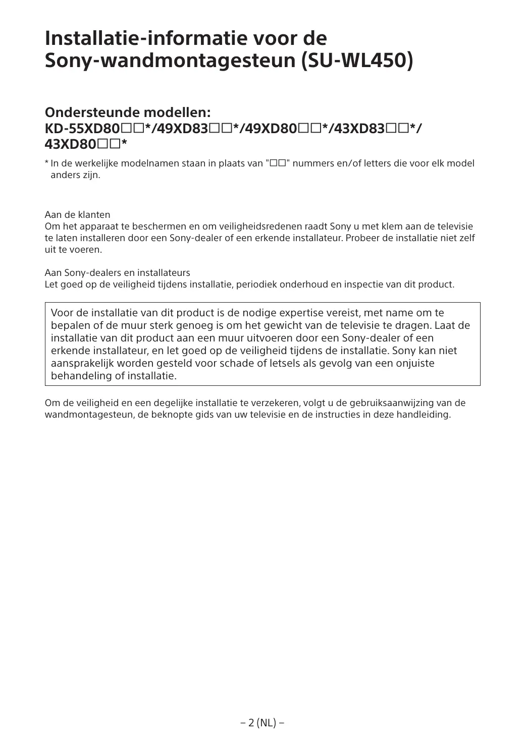 A l’attention des installateurs et revendeurs Sony Soyez particulièrement attentif à la sécurité pendant l’installation, l’entretien périodique et l’examen du produit.