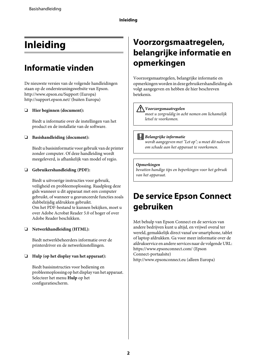 De service Epson Connect gebruiken Met behulp van Epson Connect en de services van andere bedrijven kunt u altijd, en vrijwel overal ter wereld, gemakkelijk direct vanaf uw smartphone, tablet of laptop afdrukken. Ga voor meer informatie over de afdrukservice en andere services naar de volgende URL: https://www.epsonconnect.com/ (Epson Connect-portaalsite) http://www.epsonconnect.eu (alleen Europa)