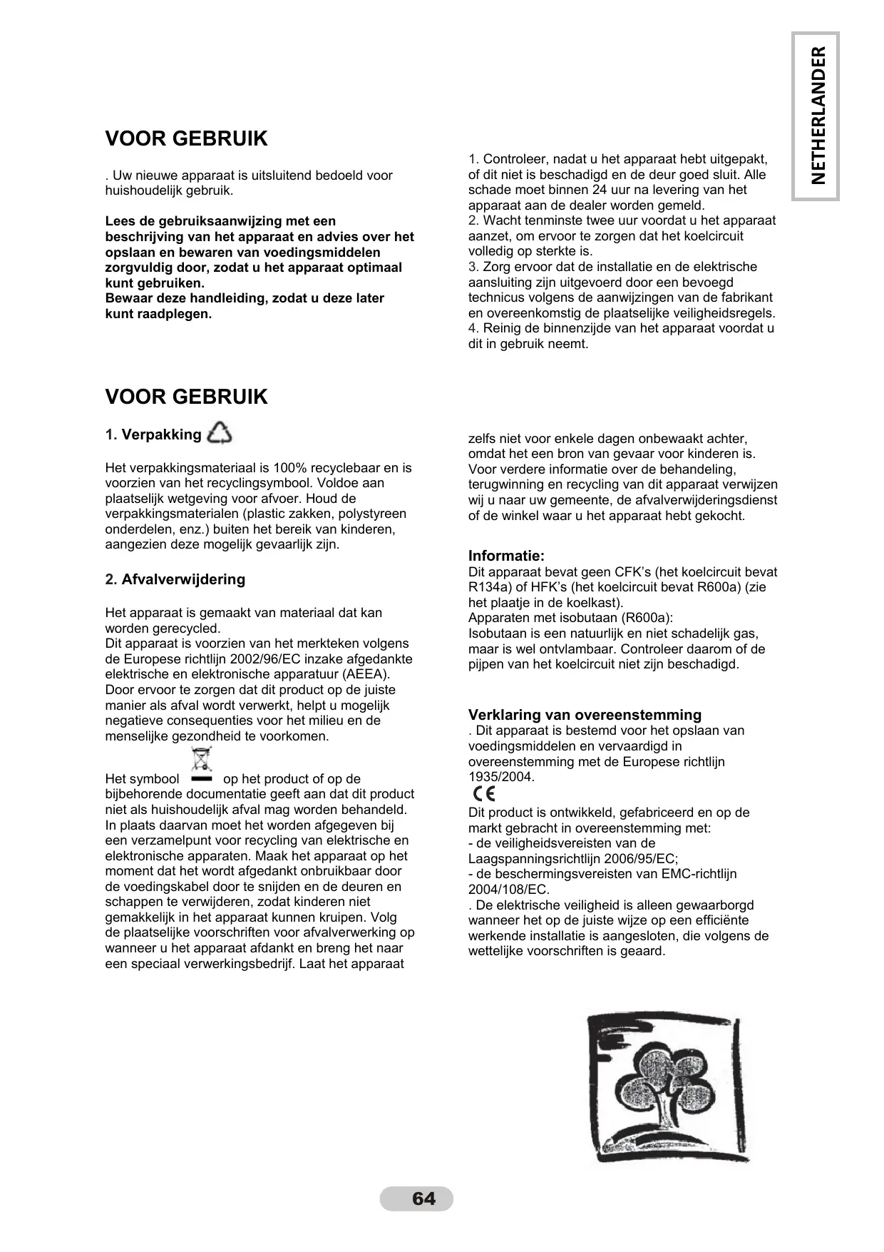 Dit apparaat bevat geen CFK's (het koelcircuit bevat R134a) of HFK's (het koelcircuit bevat R600a) (zie hetplaatie in de koelkast).