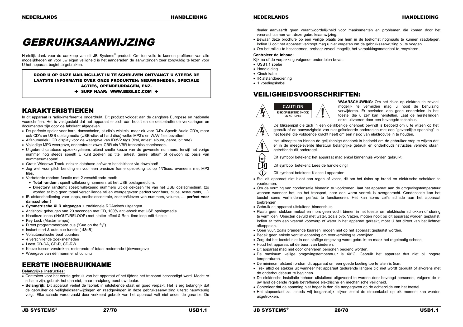 Controleer de inhoud: Kijk na of de verpakking volgende onderdelen bevat: USB1.1 speler Handleiding Cinch kabel IR afstandbediening 1 voedingskabel VEILIGHEIDSVOORSCHRIFTEN: WAARSCHUWING: Om het risico op elektrocutie zoveel mogelijk te vermijden mag u nooit de behuizing verwijderen. Er bevinden zich geen onderdelen in het toestel die u zelf kan herstellen. Laat de herstellingen enkel uitvoeren door een bevoegde technicus. De bliksempijl die zich in een gelijkbenige driehoek bevindt is bedoeld om u te wijzen op het gebruik of de aanwezigheid van niet-geïsoleerde onderdelen met een “gevaarlijke spanning” in het toestel die voldoende kracht heeft om een risico van elektrocutie in te houden. CAUTION KARAKTERISTIEKEN In dit apparaat is radio-interferentie onderdrukt. Dit product voldoet aan de gangbare Europese en nationale voorschriften. Het is vastgesteld dat het apparaat er zich aan houdt en de desbetreffende verklaringen en documenten zijn door de fabrikant afgegeven. De perfecte speler voor bars, dansscholen, studio’s winkels, maar ok voor DJ’s. Speelt: Audio CD’s, maar ook CD’s en USB opslagmedia (USB-stick of hard disc) welke MP3’s en WAV files bevatten! Alfanumeriek LCD display voor de weergave van ID3V2 tags (titel, artiest, album, genre, bit rate) Volledige MP3 weergave, ondersteunt zowel CBR als VBR transmissiesnelheden. Uitgebreid database opzoeksysteem: uiterst snelle keuze van de gewenste nummers, terwijl het vorige nummer nog steeds speelt! U kunt zoeken op titel, artiest, genre, album of gewoon op basis van nummers/mappen! Gratis Windows Track-Indexer database-software beschikbaar via download! Jog wiel voor pitch bending en voor een precieze frame opzoeking tot op 1/75sec, eveneens met MP3 files. Verbeterde random functie met 2 verschillende modi: Total random: speelt willekeurig nummers uit het USB opslagmedium. Directory random: speelt willekeurig nummers uit de gekozen file van het USB opslagmedium. (zo worden er bvb geen totaal verschillende stijlen weergegeven: perfect voor bars, clubs, restaurants, …) IR afstandbediening voor loops, snelheidscontrole, zoeken/kiezen van nummers, volume, ...: perfect voor dansscholen! Symmetrische XLR uitgangen + traditionele RCA/cinch uitgangen. Antishock geheugen van 20 seconden met CD, 100% anti-shock met USB opslagmedia Naadloze loops (IN/OUT/RELOOP) met stotter effect & Real-time loop edit functie Key Lock (Master tempo) Direct programmeerbare cue (“Cue on the fly”) Instant start & auto cue functie (-48dB) Volautomatische beat counters 4 verschillende zoeksnelheden Leest CD-DA, CD-R, CD-RW Keuze tussen verstreken, resterende of totaal resterende tijdsweergave Weergave van één nummer of continu Het uitroepteken binnen de gelijkbenige driehoek is bedoeld om de gebruiker erop te wijzen dat er in de meegeleverde literatuur belangrijke gebruik en onderhoudsinstructies vermeld staan betreffende dit onderdeel. Dit symbool betekent: het apparaat mag enkel binnenhuis worden gebruikt. Dit symbool betekent: Lees de handleiding! Dit symbool betekent: Klasse I apparaten Belangrijke instructies: Controleer voor het eerste gebruik van het apparaat of het tijdens het transport beschadigd werd. Mocht er schade zijn, gebruik het dan niet, maar raadpleeg eerst uw dealer. Belangrijk: Dit apparaat verliet de fabriek in uitstekende staat en goed verpakt. Het is erg belangrijk dat de gebruiker de veiligheidsaanwijzingen en raadgevingen in deze gebruiksaanwijzing uiterst nauwkeurig volgt. Elke schade veroorzaakt door verkeerd gebruik van het apparaat valt niet onder de garantie. De Stel dit apparaat niet bloot aan regen of vocht, dit om het risico op brand en elektrische schokken te voorkomen. Om de vorming van condensatie binnenin te voorkomen, laat het apparaat aan de omgevingstemperatuur wennen wanneer het, na het transport, naar een warm vertrek is overgebracht. Condensatie kan het toestel soms verhinderen perfect te functioneren. Het kan soms zelfs schade aan het apparaat toebrengen. Gebruik dit apparaat uitsluitend binnenshuis. Plaats geen stukken metaal en mors geen vocht binnen in het toestel om elektrische schokken of storing te vermijden. Objecten gevuld met water, zoals bvb. Vazen, mogen nooit op dit apparaat worden geplaatst. Indien er toch een vreemd voorwerp of water in het apparaat geraakt, moet U het direct van het lichtnet afkoppelen. Open vuur, zoals brandende kaarsen, mogen niet op het apparaat geplaatst worden. Bedek geen enkele ventilatieopening om oververhitting te vermijden. Zorg dat het toestel niet in een stoffige omgeving wordt gebruikt en maak het regelmatig schoon. Houd het apparaat uit de buurt van kinderen. Dit apparaat mag niet door onervaren personen bediend worden. De maximum veilige omgevingstemperatuur is 40°C. Gebruik het apparaat dus niet bij hogere temperaturen. De minimum afstand rondom dit apparaat om een goede koeling toe te laten is 5cm. Trek altijd de stekker uit wanneer het apparaat gedurende langere tijd niet wordt gebruikt of alvorens met de onderhoudsbeurt te beginnen. De elektrische installatie behoort uitsluitend uitgevoerd te worden door bevoegd personeel, volgens de in uw land geldende regels betreffende elektrische en mechanische veiligheid. Controleer dat de spanning niet hoger is dan die aangegeven op de achterzijde van het toestel. Het stopcontact zal steeds vrij toegankelijk blijven zodat de stroomkabel op elk moment kan worden uitgetrokken. JB SYSTEMS® JB SYSTEMS® EERSTE INGEBRUIKNAME 27/78 USB1.1 28/78 USB1.1 NEDERLANDS HANDLEIDING De elektrische kabel behoort altijd in uitstekende staat te zijn. Zet het apparaat onmiddellijk af als de elektrische kabel gekneusd of beschadigd is. De kabel moet vervangen worden door de fabrikant zelf, zijn dealer of vergelijkbare bekwame personen om een brand te voorkomen. Laat de elektrische draad nooit in contact komen met andere draden. Als de netschakelaar zich in OFF (uit) positie bevindt dan is dit apparaat niet volledig van het lichtn