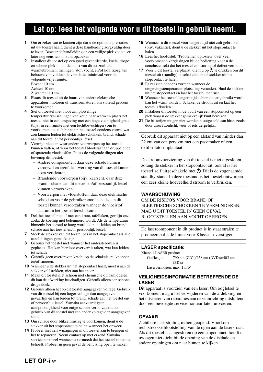 Cet appareil n’est pas déconnecté du secteur tant qu’il reste branché à la prise de courant, même si l’appareil en soi est éteint par la touche p. Il se trouve alors « en veille ». Dans cet état, l’appareil consomme une très faible quantité de courant. AVERTISSEMENT POUR RÉDUIRE LES RISQUES DINCENDIE OU DE DÉCHARGE ÉLECTRIQUE, N’EXPOSEZ PAS CET APPAREIL À LA PLUIE OU À L’HUMIDITÉ. Le laser de cet appareil peut émettre un rayonnement dépassant les limites de la classe 1. Caractéristiques du LASER : Produit LASER de Classe 1 Longueur d’onde : 790 nm (pour les CD)/658 nm (pour les DVD)/405 nm (pour les Blu-ray)
