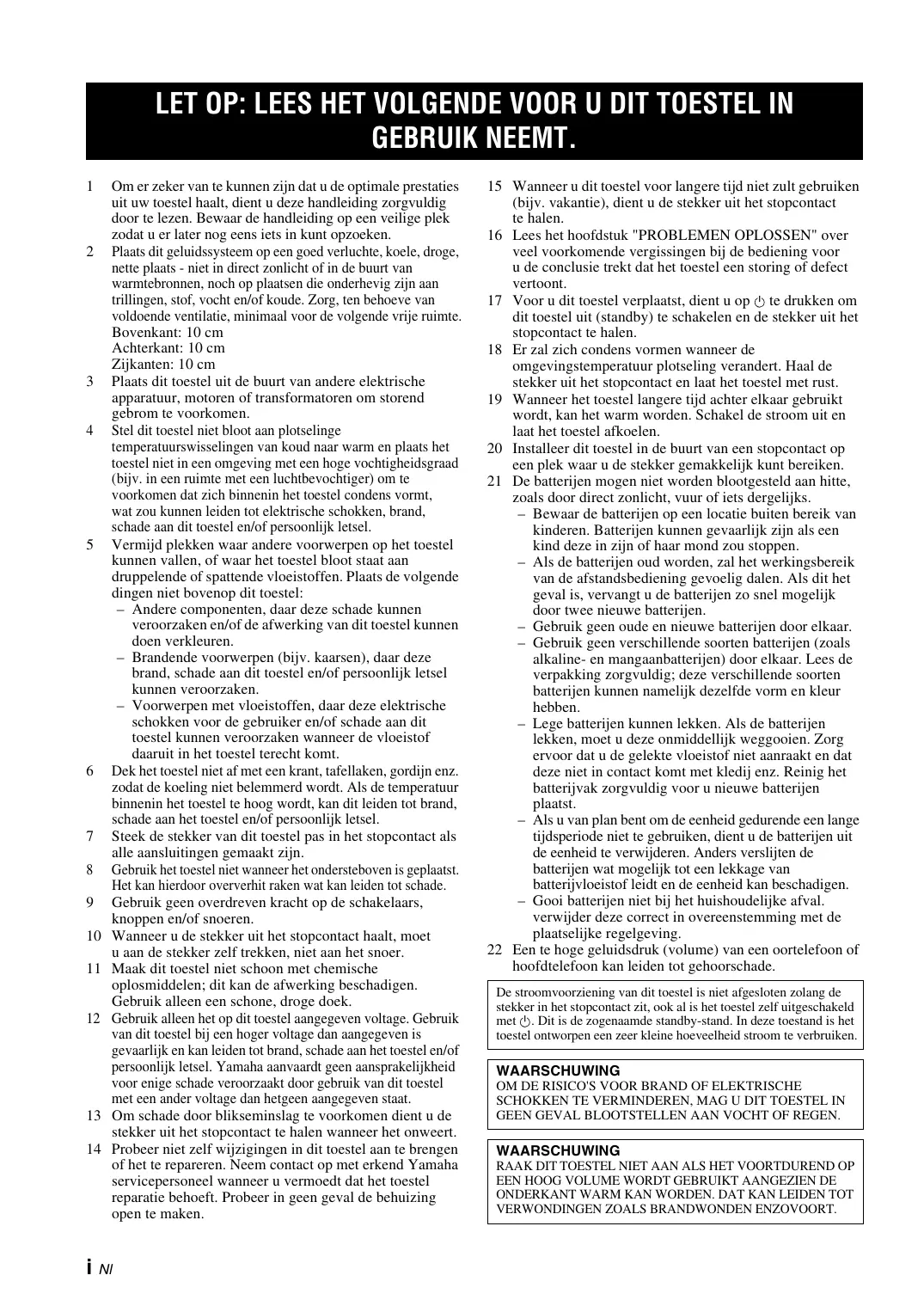 16 Lisez la section intitulée « GUIDE DE DÉPANNAGE » où figurent une liste d’erreurs de manipulation communes avant de conclure que l’appareil présente une anomalie de fonctionnement. 17 Avant de déplacer l’appareil, appuyez sur pour placer l’appareil en veille puis débranchez la fiche du cordon d’alimentation au niveau de la prise secteur. 18 La condensation se forme lorsque la température ambiante change brusquement. En ce cas, débranchez la fiche du câble d’alimentation et laissez l’appareil reposer. 19 La température de l’appareil peut augmenter en raison d’une utilisation prolongée. En ce cas, coupez l’alimentation de l’appareil et laissez-le au repos pour qu’il refroidisse. 20 Installez cet appareil à proximité de la prise secteur et à un emplacement où la fiche du câble d’alimentation est facilement accessible. 21 Les piles ne doivent pas être exposées à une chaleur extrême, par exemple au soleil, à une flamme, etc. – Conservez les piles hors de portée des enfants. Les piles constituent un danger potentiel si les enfants les mettent en bouche. – Si les piles sont vieilles, la portée de la télécommande risque de diminuer considérablement. Le cas échéant, remplacez les piles le plus rapidement possible par deux piles neuves. – N’utilisez pas à la fois des piles neuves et des piles usagées. – N’utilisez pas non plus des piles de deux types différents (par exemple, des piles alcalines et des piles au manganèse). Lisez les instructions de l’emballage, car ces types de piles peuvent être de forme et de couleur différentes. – Des piles épuisées risquent de fuir. En cas de fuite, jetez les piles immédiatement. Évitez de toucher le liquide qui a fui et veillez à ce qu’il n’entre pas en contact avec vos vêtements, etc. Nettoyez soigneusement le logement d’insertion des piles avant d’insérer de nouvelles piles. – Retirez les piles de l’appareil si vous n’avez pas l’intention d’utiliser ce dernier pendant une période prolongée. Sans cela, les piles s’usent et risquent de fuir, ce qui pourrait endommager l’appareil. – Ne jetez pas les piles avec les ordures ménagères. Mettez-les au rebut conformément aux réglementations locales en vigueur. 22 Une pression excessive du son par les écouteurs et le casque d’écoute peut entraîner la perte de l’ouïe. Cet appareil n’est pas déconnecté du secteur tant qu’il reste branché à la prise de courant, même si l’appareil en soi est éteint par la touche . Il se trouve alors « en veille ». En mode veille, l’appareil consomme une très faible quantité de courant.