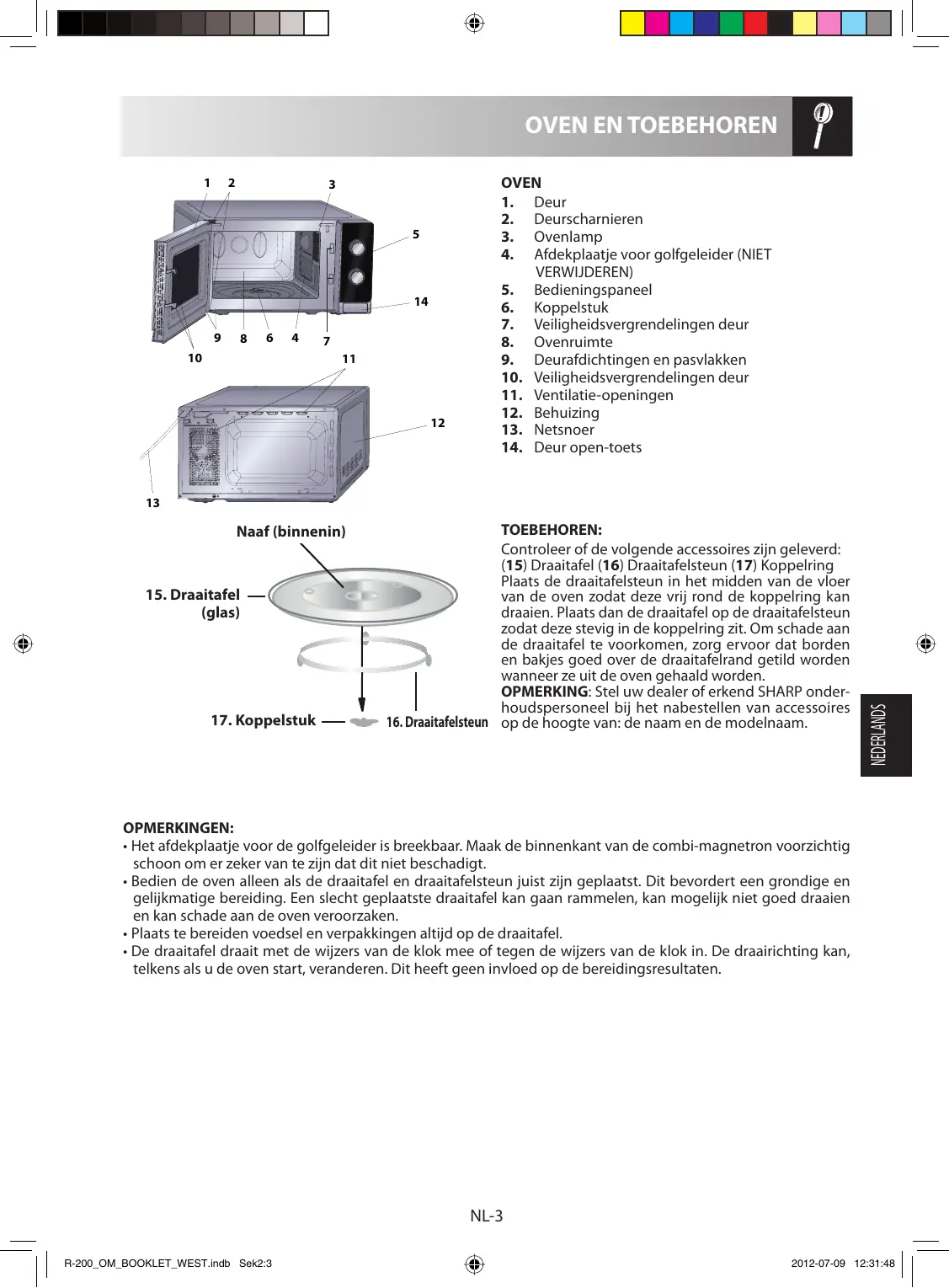 WAARSCHUWING: Plaats de oven niet op een plek waar hitte of vochtigheid onstaat (bijvoorbeeld naast of boven een conventionele oven) of naast brandbare materialen (bijvoorbeeld gordijnen). Blokkeer of belemmer de ventilatieopeningen niet. Plaats geen objecten op de oven. NL-7 R-200_OM_BOOKLET_WEST.indb Sek2:7 2012-07-09 12:31:49