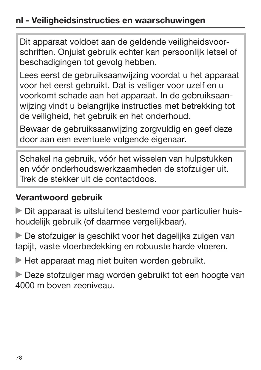 nl - Veiligheidsinstructies en waarschuwingen Dit apparaat voldoet aan de geldende veiligheidsvoorschriften. Onjuist gebruik echter kan persoonlijk letsel of beschadigingen tot gevolg hebben. Lees eerst de gebruiksaanwijzing voordat u het apparaat voor het eerst gebruikt. Dat is veiliger voor uzelf en u voorkomt schade aan het apparaat. In de gebruiksaanwijzing vindt u belangrijke instructies met betrekking tot de veiligheid, het gebruik en het onderhoud. Bewaar de gebruiksaanwijzing zorgvuldig en geef deze door aan een eventuele volgende eigenaar. Schakel na gebruik, vóór het wisselen van hulpstukken en vóór onderhoudswerkzaamheden de stofzuiger uit. Trek de stekker uit de contactdoos. Verantwoord gebruik Dit apparaat is uitsluitend bestemd voor particulier huishoudelijk gebruik (of daarmee vergelijkbaar). De stofzuiger is geschikt voor het dagelijks zuigen van tapijt, vaste vloerbedekking en robuuste harde vloeren. Het apparaat mag niet buiten worden gebruikt. Deze stofzuiger mag worden gebruikt tot een hoogte van 4000 m boven zeeniveau.