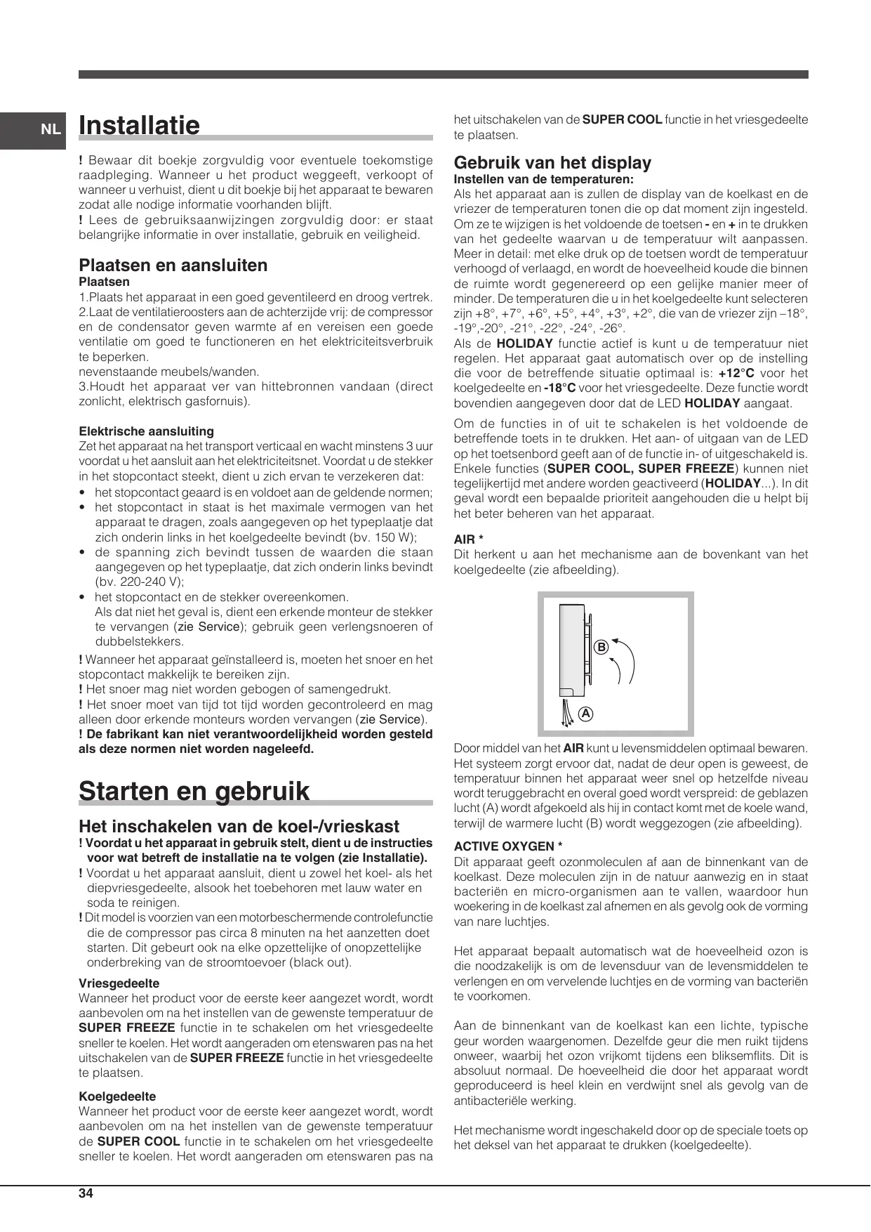 Si l’appareil est en service, les afficheurs du compartiment réfrigérateur et du compartiment congélateur visualiseront les températures sélectionnées à ce moment-là. Pour les modifier, appuyer sur les touches - et + correspondant au compartiment à l’intérieur duquel la température doit être modifiée. Chaque pression sur les touches fait augmenter ou diminuer la température et, de façon équivalente, la quantité de froid généré à l’intérieur du compartiment. Les températures du compartiment réfrigérateur sélectionnables sont: +8°, +7°, +6°, +5°, +4°, +3°, +2°. Celles du congélateur sont : –18°, -19°,-20°, -21°, -22°, -24°, -26°. Quand la fonction HOLIDAY est activée, aucun réglage de température n’est plus possible, l’appareil se place automatiquement au réglage optimal correspondant: +12°C dans le compartiment réfrigérateur et -18°C dans le compartiment congélateur, cette condition est aussi signalée par allumage de la LED HOLIDAY. Pour activer ou désactiver les fonctions, il suffit d’appuyer sur la touche correspondante, la LED correspondante s’allume ou s’éteint sur le tableau de bord pour signaler l’état de la fonction. Certaines fonctions (SUPER COOL, SUPER FREEZE) sont incompatibles avec d’autres (HOLIDAY,..), dans ce cas il y a une priorité déjà établie pour faciliter la gestion de l’appareil. AIR* On le reconnaît à la présence d’un dispositif appliqué à la paroi dans le haut du compartiment réfrigérateur (voir figure).