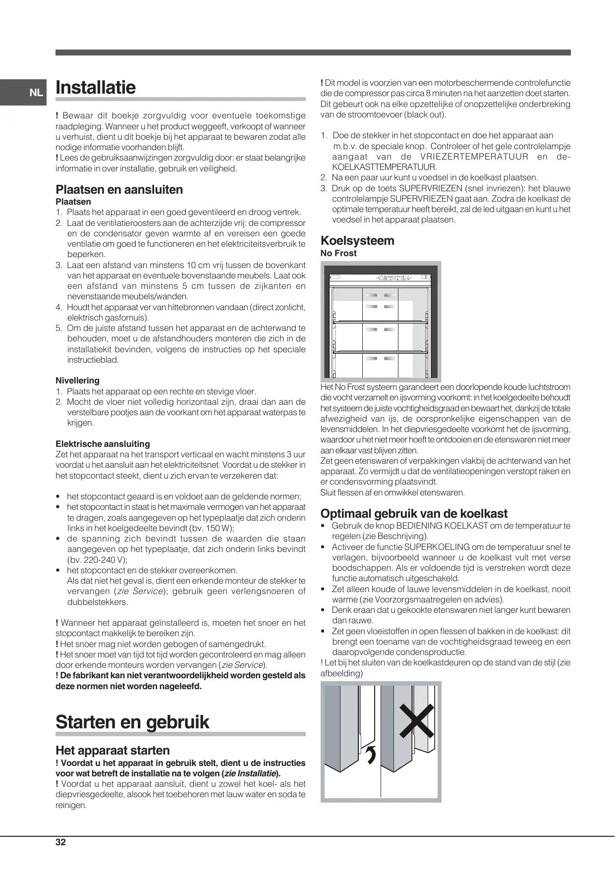 - het stopcontact en de stekker overeenkomen. Als dat niet het geval is, dient een erkende monteur de stekker te vervangen (zie Service); gebruik geen verlengsnoeren of dubbelstekkers. ! Wanneer het apparaat geïnstalleerd is, moeten het snoer en het stopcontact makkelijk te bereiken zijn. ! Het snoer mag niet worden gebogen of samengedrukt. ! Het snoer moet van tijd tot tijd worden gecontroleerd en mag alleen door erkende monteurs worden vervangen (zie Service). ! De fabrikant kan niet verantwoordelijkheid worden gesteld als deze normen niet worden nageleefd. Starten en gebruik Het apparaat starten ! Voordat u het apparaat in gebruik stelt, dient u de instructies voor wat betreft de installatie na te volgen (zie Installatie). ! Voordat u het apparaat aansluit, dient u zowel het koel- als het diepvriesgedeelte, alsook het toebehoren met lauw water en soda te reinigen.