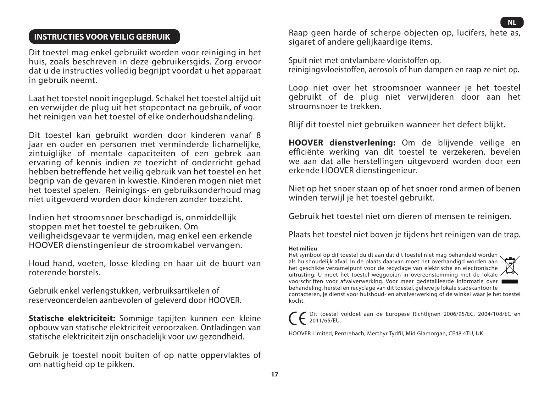 Service HOOVER: Pour assurer l’utilisation sûre et efficace de cet appareil, nous recommandons de n’en confier l’entretien ou les réparations qu’à un réparateur HOOVER agréé.