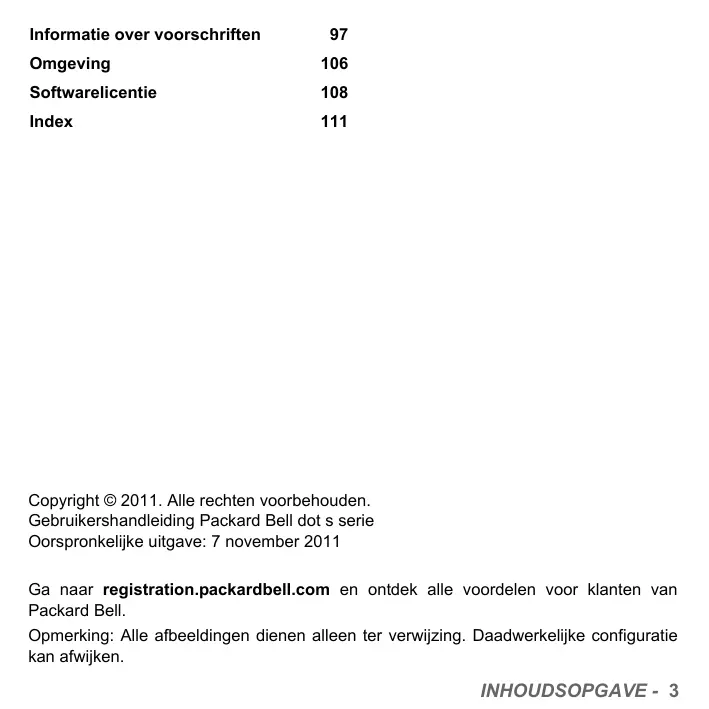 Copyright © 2011. Alle rechten voorbehouden. Gebruikershandleiding Packard Bell dot s serie Oorspronkelijke uitgave: 7 november 2011 Ga naar registration.packardbell.com en ontdek alle voordelen voor klanten van Packard Bell. Opmerking: Alle afbeeldingen dienen alleen ter verwijzing. Daadwerkelijke configuratie kan afwijken. INHOUDSOPGAVE - 3