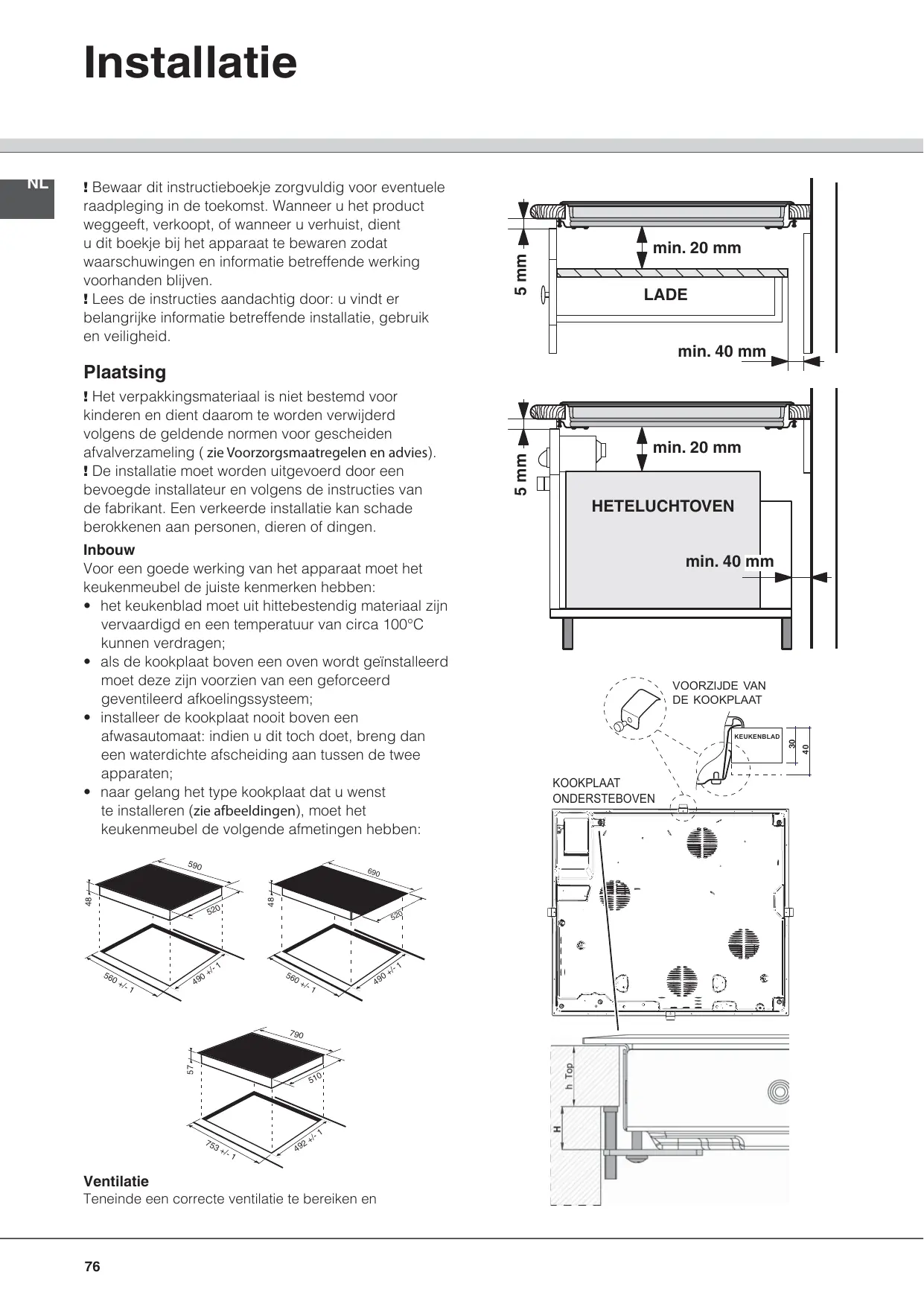Inbouw Voor een goede werking van het apparaat moet het keukenmeubel de juiste kenmerken hebben: • het keukenblad moet uit hittebestendig materiaal zijn vervaardigd en een temperatuur van circa 100°C kunnen verdragen; • als de kookplaat boven een oven wordt geïnstalleerd moet deze zijn voorzien van een geforceerd geventileerd afkoelingssysteem; • installeer de kookplaat nooit boven een afwasautomaat: indien u dit toch doet, breng dan een waterdichte afscheiding aan tussen de twee apparaten; • naar gelang het type kookplaat dat u wenst te installeren (zie afbeeldingen), moet het keukenmeubel de volgende afmetingen hebben: