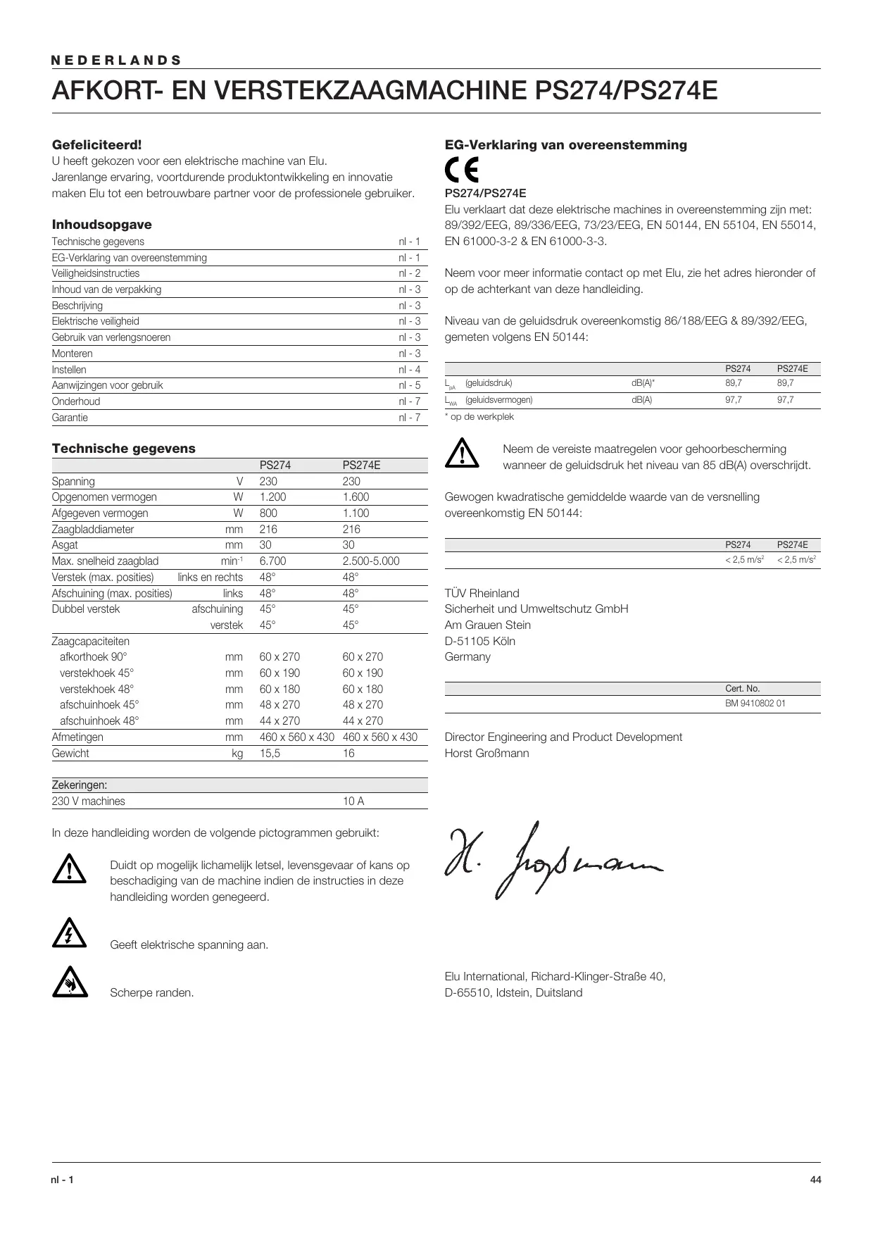 - op de werkplek Neem de vereiste maatregelen voor gehoorbescherming wanneer de geluidsdruk het niveau van 85 dB(A) overschrijdt. Gewogen kwadratische gemiddelde waarde van de versnelling overeenkomstig EN 50144: PS274 PS274E < 2,5 m/s2 < 2,5 m/s2 TÜV Rheinland Sicherheit und Umweltschutz GmbH Am Grauen Stein D-51105 Köln Germany Cert. No. BM 9410802 01 Director Engineering and Product Development Horst Großmann 10 A In deze handleiding worden de volgende pictogrammen gebruikt: Duidt op mogelijk lichamelijk letsel, levensgevaar of kans op beschadiging van de machine indien de instructies in deze handleiding worden genegeerd. Geeft elektrische spanning aan. Scherpe randen. nl - 1 Elu International, Richard-Klinger-Straße 40, D-65510, Idstein, Duitsland
