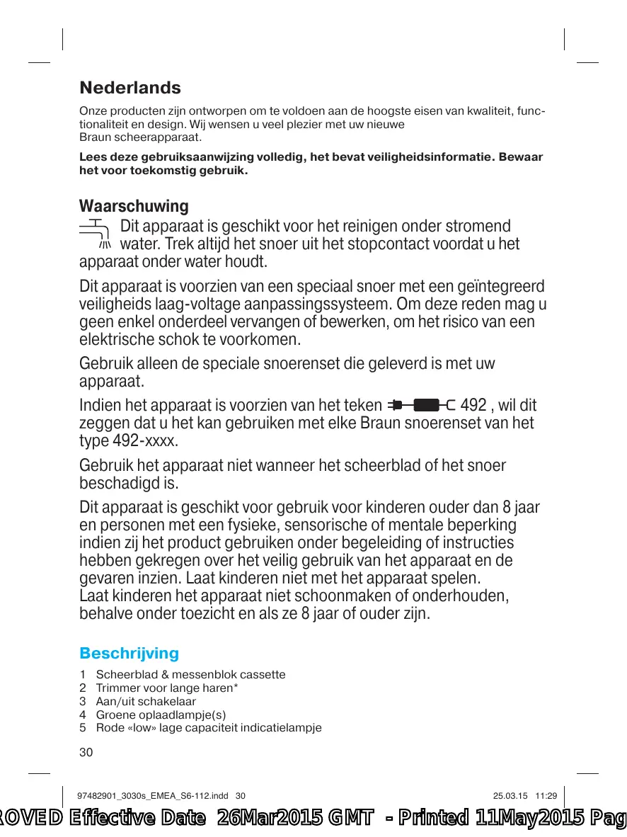 492, puede utilizarlo con cualquier cable de alimentación de Braun con código tipo 492-XXXX. No se afeite si tiene una lámina o el cable de alimentación dañados. Este aparato puede ser utilizado por niños a partir de los 8 años y personas con capacidades físicas, sensoriales o mentales reducidas o con falta de experiencia y conocimiento, si lo hacen bajo supervisión o si se les ha dado instrucciones adecuadas para el uso seguro del aparato y entienden los riesgos que implica. Los niños no deben jugar con el aparato. Los niños deben ser mayores de 8 años para realizar la limpieza y el mantenimiento del aparato, y siempre bajo supervisión. Descripción Luz roja indicadora de carga baja Indicador de recambio de piezas Enchufe de la afeitadora Cable especial (el diseño puede variar) Protector del cabezal
